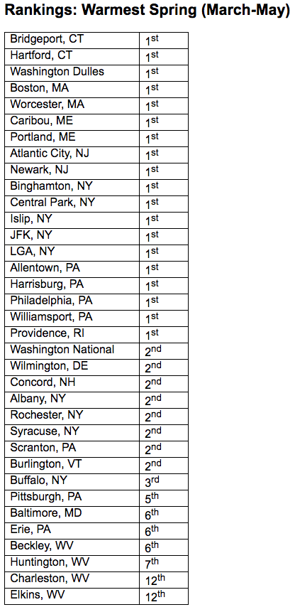 Temperatures averaged well above normal during the period March through May 2010. Of the 12 states in the Northeast, eight had their warmest spring since 1895. The remaining states averaged within the top ten warmest springs on record and the region as a whole averaged 2nd warmest spring n 116 years. In addition, all but two of the 35 first order stations in the Northeast were within the top ten warmest on record.