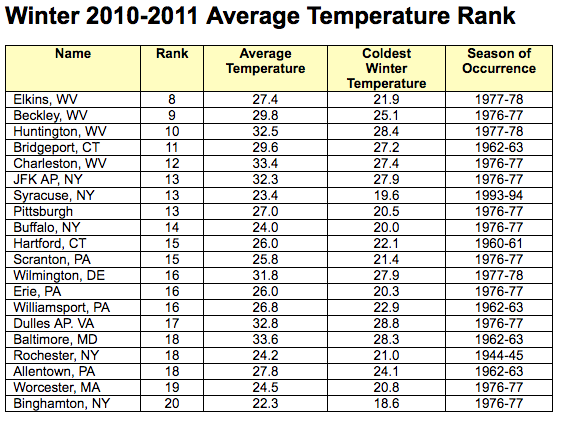 Temperatures during the winter of 2010-2011 (climatological winter Dec-Feb) have been colder than normal in all the states in the region except Maine. The region’s average temperature was 24.2 degrees, which was 2.0 degrees colder than normal. State departures ranged from -3.3 degrees in Maryland and Delaware to +1.2 degrees in Maine. Several Northeast Cities had averages that were in the top 20 coldest on record, including Elkins, WV, 8th coldest; Bridgeport, CT, 11th coldest; and Buffalo, NY, 14th coldest. On the flip side, Caribou, ME had its 4th warmest winter on record (Caribou’s records go back to 1939).