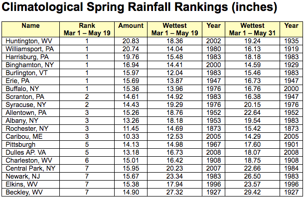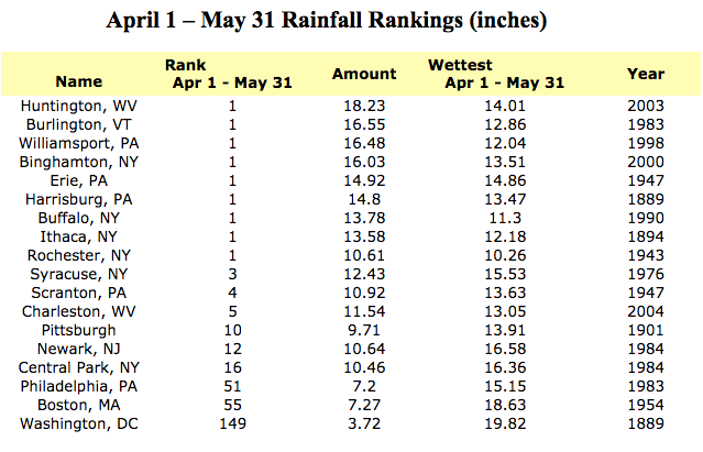 As noted previously, it’s been wet in the Northeast. Looking at climatological spring to date (March 1 - May 19), there are very few areas in the region that have been drier than normal, while parts of Vermont, New York, Pennsylvania and West Virginia have seen over 200% of their normal precipitation amount. At the station level, 23 of the 35 first order observation stations in the Northeast are currently ranked in the top ten wettest Mar 1 - May 19 on record. Five of the stations have already surpassed their March through May record rainfall amounts. At the completion of May, April 1 - May 31 precipitation totals also broke records.