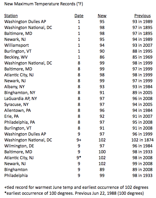 After four months in a row with above normal precipitation, the Northeast ended up drier than normal in June. The region’s monthly total was 89 percent of normal; state departures ranged from 63% of normal in Maryland to 127% of normal in Connecticut. Temperatures were on the warm side in June, especially during the early part of the month, when record breaking heat encompassed the region.