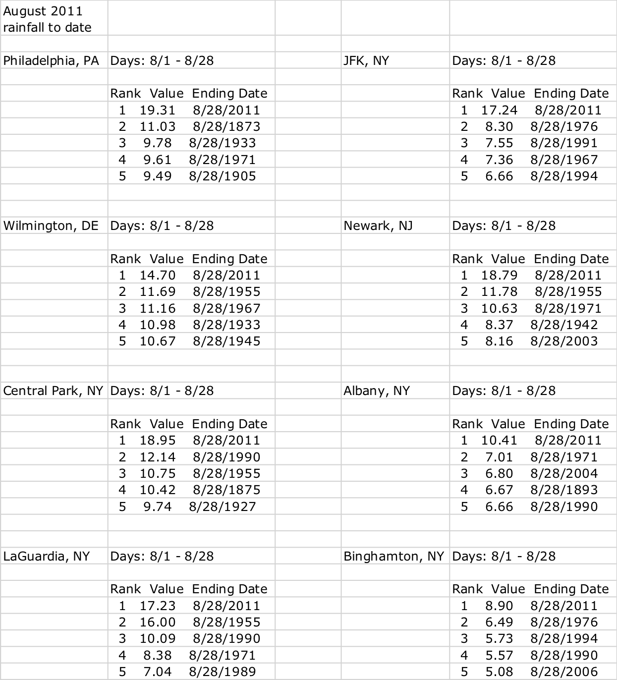 The heaviest rain totals from Hurricane Irene were concentrated in the most vulnerable areas of the Northeast. Eastern Pennsylvania, New Jersey and southern New York had already seen record-breaking rainfall totals this month. The additional 6-plus inches from the storm put streams and rivers well over their banks as the ground could not absorb any more water. Heavy rain in the Delaware, Hudson, and Connecticut River watersheds, lead to immediate local flooding, but will also prolong flooding in areas downstream as the runoff drains to the sea.