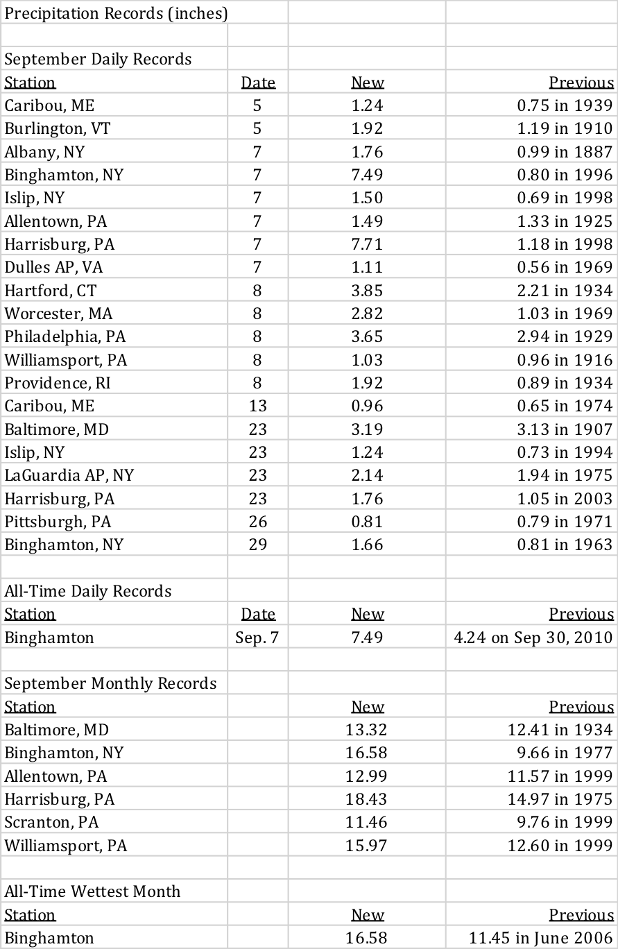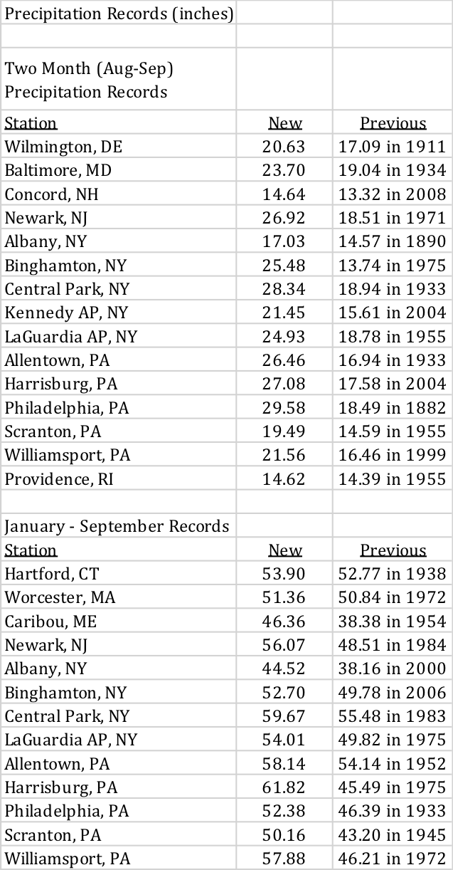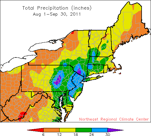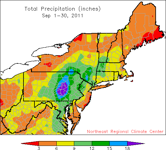 Most of the Northeast saw precipitation totals well above normal along with warmer than normal temperatures in September. Rainfall totals were impressive across eastern Pennsylvania and southeastern New York, thanks to Tropical Storm Lee and a few other significant rain events during the month. When August, another wet month, was included, the 2-month rainfall totals totals jumped to the 12-30 inch range. Nine-month totals of 40 - 70 inches were equal to or above average throughout the region. With all this precipitation, new daily, monthly, and multi-month rainfall records were set from Caribou to Baltimore. The January - September totals at Binghamton, NY and Harrisburg, PA have even topped their all-time yearly totals.