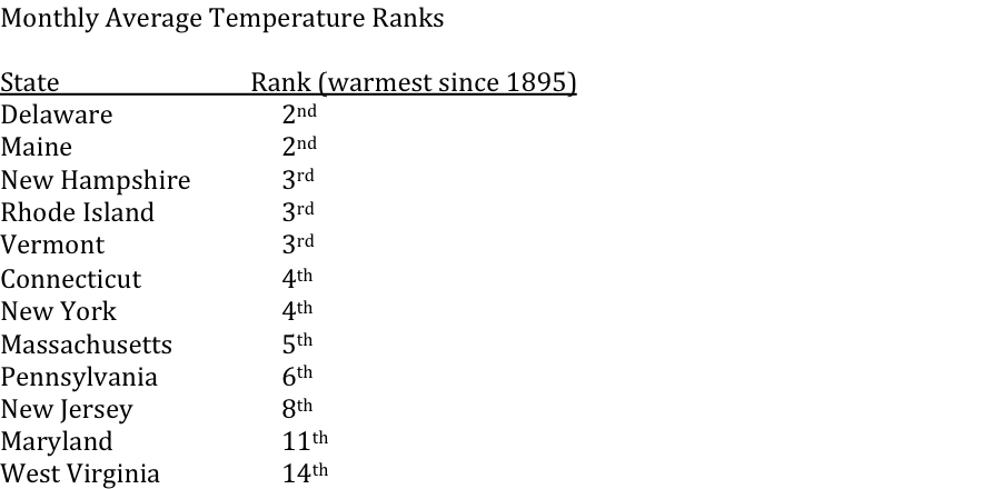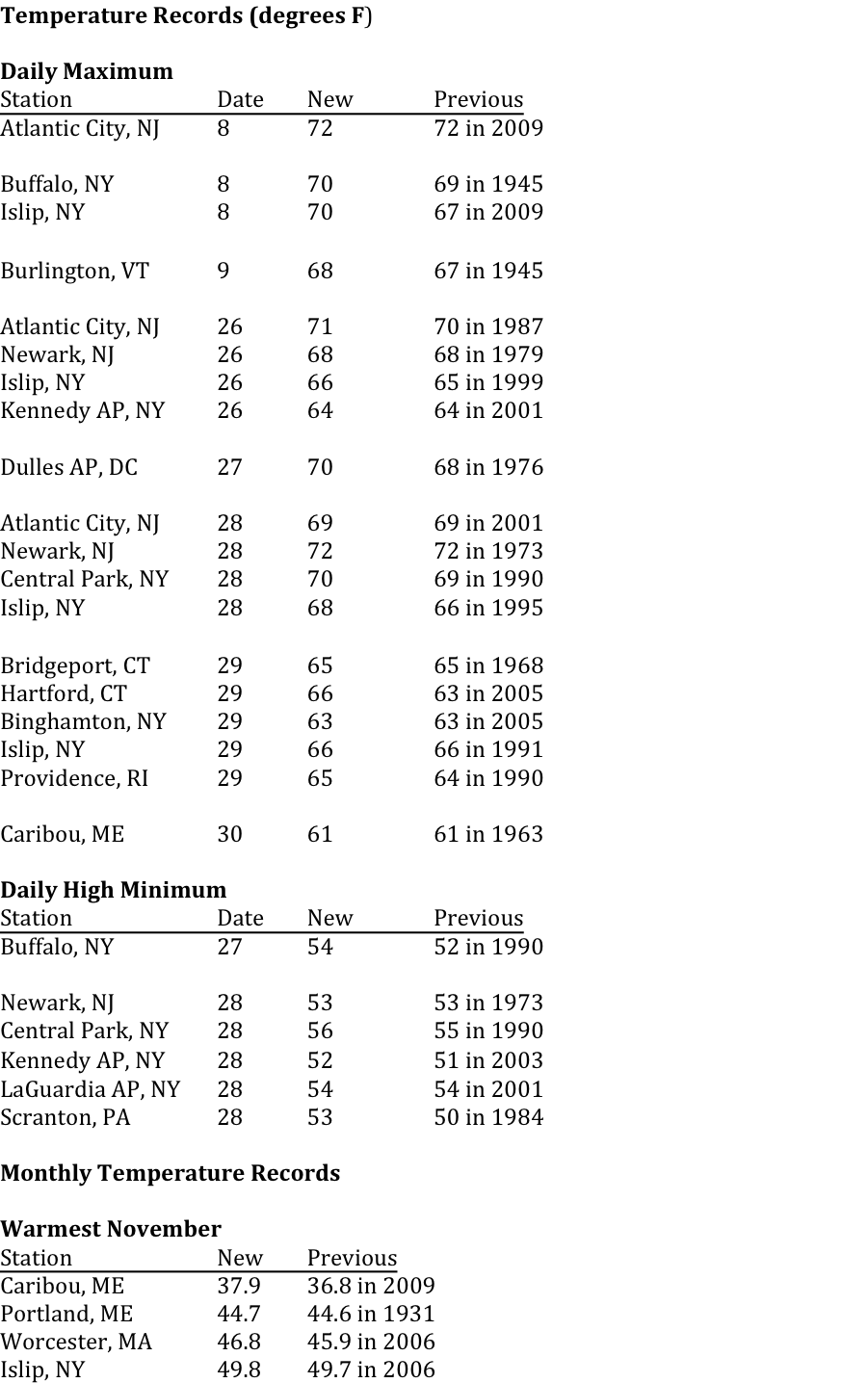 November 2011 was the eleventh consecutive month with above normal temperatures in the Northeast and the 3rd warmest November since 1895. The regional average temperature of 44.0 degrees was 4.3 degrees above normal. Each of the states in the region placed within the top 14 warmest in 117 years. In addition, new daily and monthly temperature records were established at several locations around the region. Three states, Massachusetts, Rhode Island, and Vermont, also had their warmest autumn (Sep-Nov) on record. It was the 4th warmest autumn in the Northeast since 1895.