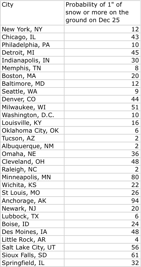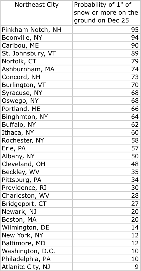 So far this winter season, the only major snow event in the Northeast was the unusually severe late October storm. Several cities that normally see up to 40 inches of snow from October through December accumulated less than 6 inches through December 14th. With temperatures expected to remain above normal and precipitation amounts below normal for the next two weeks, Santa might need a different vehicle while making his rounds in the Northeastern US. For those with hope, we have a chart of historical white Christmas probabilities for selected cities in the Northeast and the US.