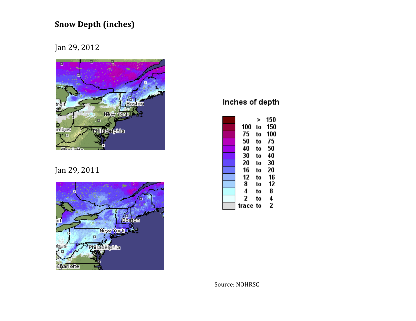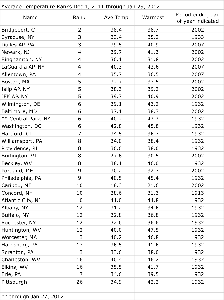 So far, the 2011-12 winter has averaged warmer than normal, with temperatures in much of the Northeast averaging at least 5 degrees above normal. The 60-day average was within the top 20 warmest on record at all but one of the first order stations in the region. This winter’s prevailing storm path, combined with the warmer temperatures has kept significant snowfall at bay. Consequently, there is not a lot of snow on the ground, especially when compared to last year.