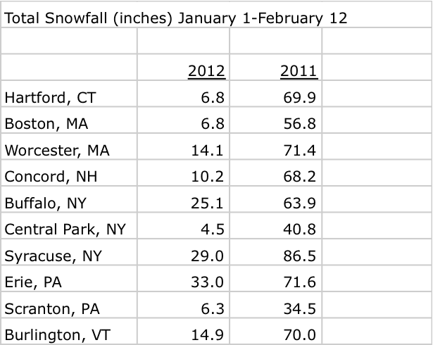 What a difference a year makes! So far, temperatures during the beginning of 2012 have averaged warmer than normal in the Northeast. Just a year ago, most of the region was colder than normal by the 12th of February. While precipitation during the same period averaged on the dry side both years, several cities have seen quite a difference in snowfall totals from last year to this year.