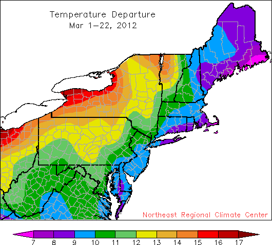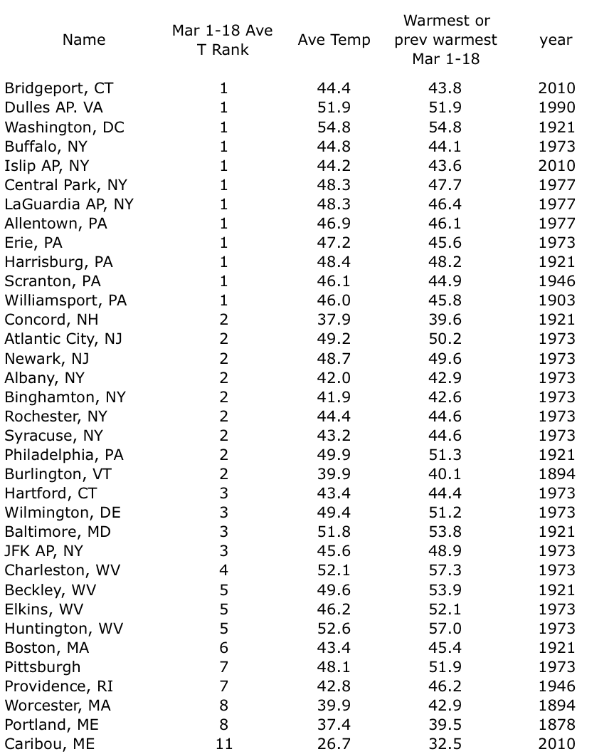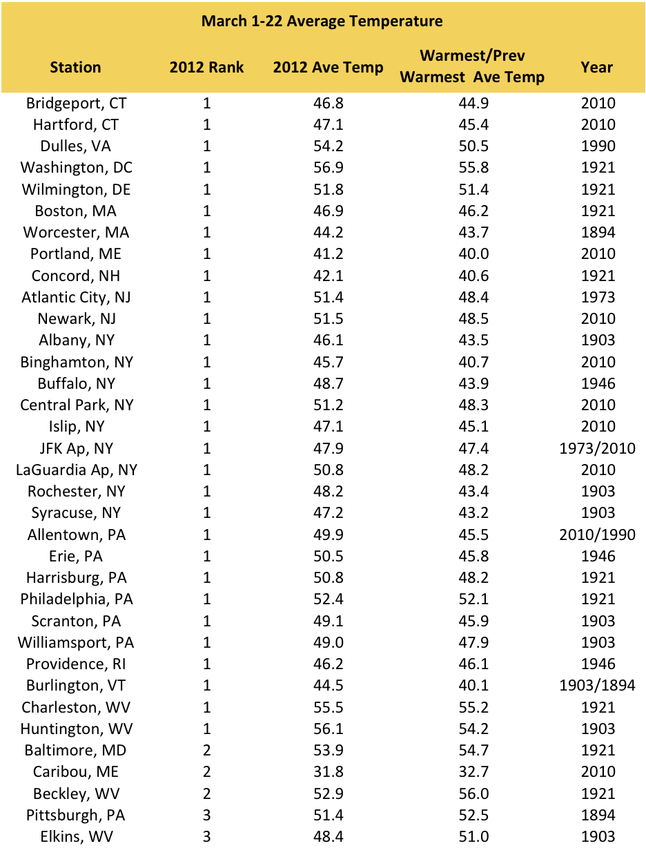 Temperatures are continuing to average well above normal. Almost all First Order Stations are ranking within the top 10 warmest for the first 18 days this month and many are ranking as the warmest. This trend continued with all First Order Stations ranking within the top 5 warmest for the first 22 days of March and many are ranking as the warmest.