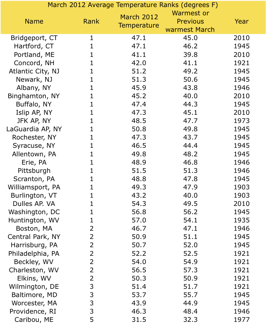 As expected, March average temperatures were well above normal. This is the twelfth consecutive month that the Northeast has seen warmer than normal temperatures. All First Order Stations ranked within the top 5 warmest March’s and more than half ranked as the warmest on record.