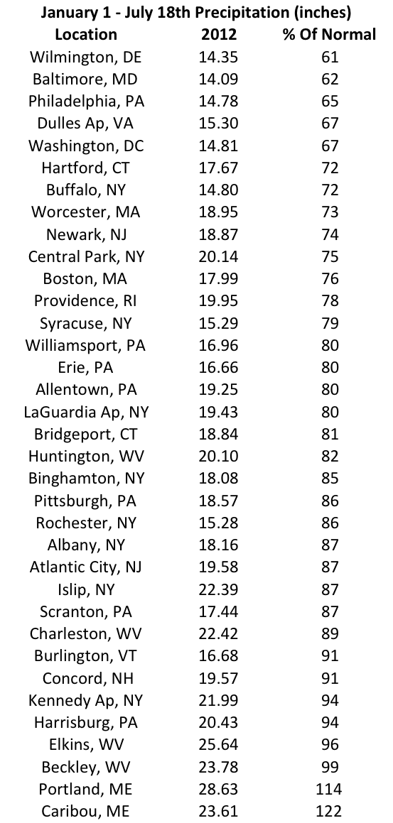 The first half of 2012 was dry for most of the Northeast. New York, Massachusetts, Pennsylvania, New Jersey, and West Virginia were below normal, Maryland and Connecticut were much below normal, and Delaware had its driest record. The Northeast as a whole had 89% of it normal precipitation for the 6-month period. The lack of rain has continued into July, causing abnormally dry and moderate drought conditions to spread across the Northeast. Year-to-date precipitation, through July 18th, is below normal at all of the First Order stations, excluding those in Maine. Thirteen of the 35 stations have had less than 80% of normal precipitation, the driest areas being Wilmington DE, Baltimore MD, and Philadelphia PA. Dry conditions are expected to persist in a band stretching from Lake Erie east through Albany as well as western Pennsylvania. The same holds for Maryland, Delaware, western Massachusetts and parts of Virginia, although conditions in those areas are expected to slightly improve.