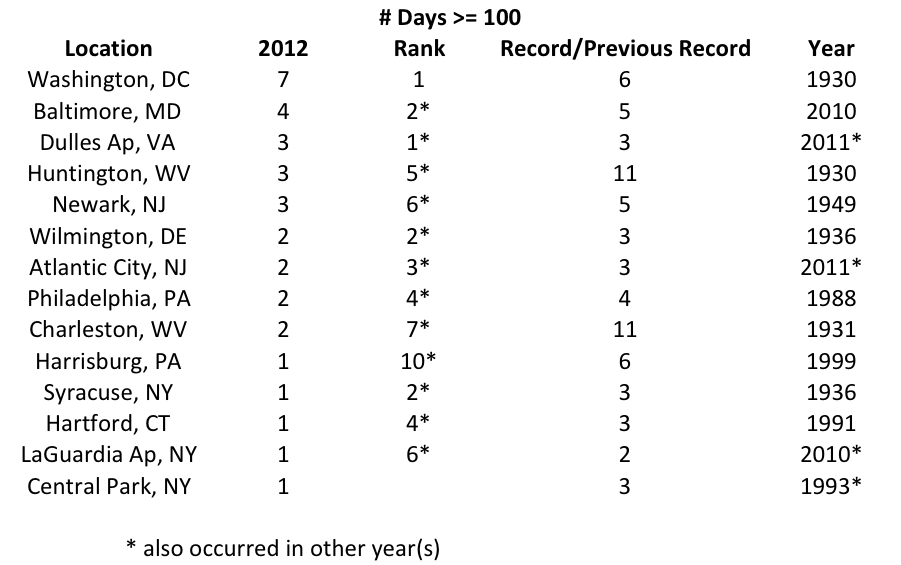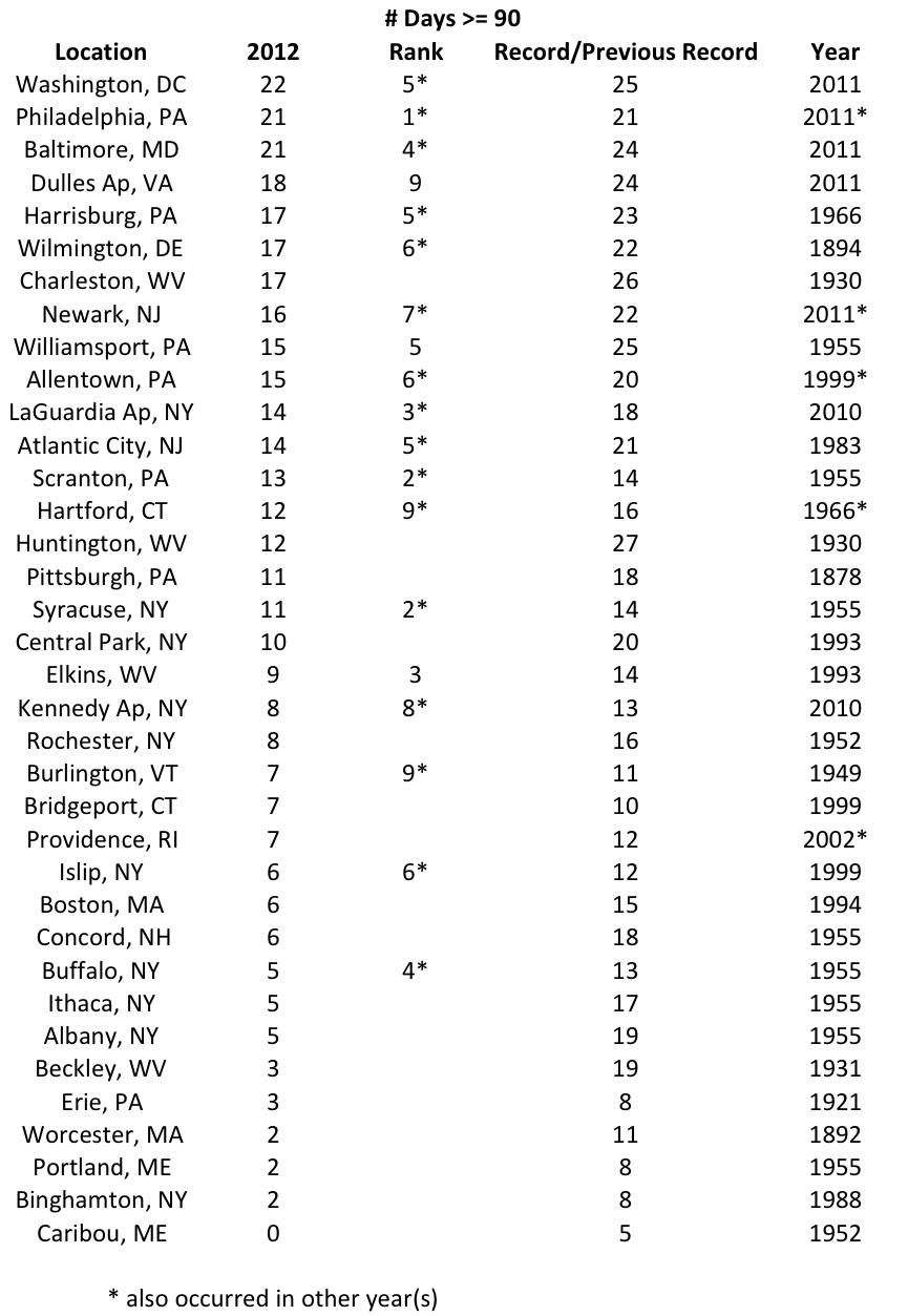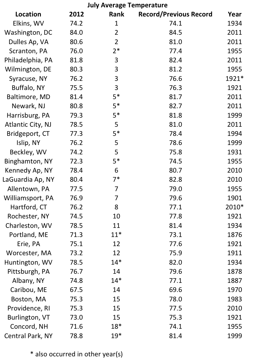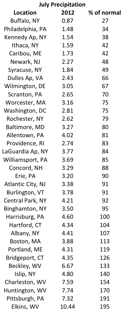 July 2012 was the hottest month on record for the contiguous US. In the Northeast it was the 7th warmest July since 1895 and the warmest January through July on record. July 2012 was filled with hot temperatures and dry conditions for most areas of the Northeast. Of the 35 First Order stations, 16 ranked in their top 5 warmest July’s. Elkins, WV had their warmest July on record! All but one station recorded temperatures in the 90’s. Washington, DC had 22 days of 90 or hotter, more than any other First Order station this month, but Philadelphia tied their July record for 21 days of 90 or hotter with 2011. There were also 14 First Order stations with at least one 100-degree day! Washington, DC again had the most, with 7 days, which broke their previous record of 6 days in 1930. Dulles Airport tied 2011 for their record with 3 days in the 100’s. Rainfall amounts varied widely across the Northeast, from only 27% of normal in Buffalo, NY to 195% of normal in Elkins, WV. Some areas did get much needed rain, but all states excluding Maine continue to have abnormally dry conditions.