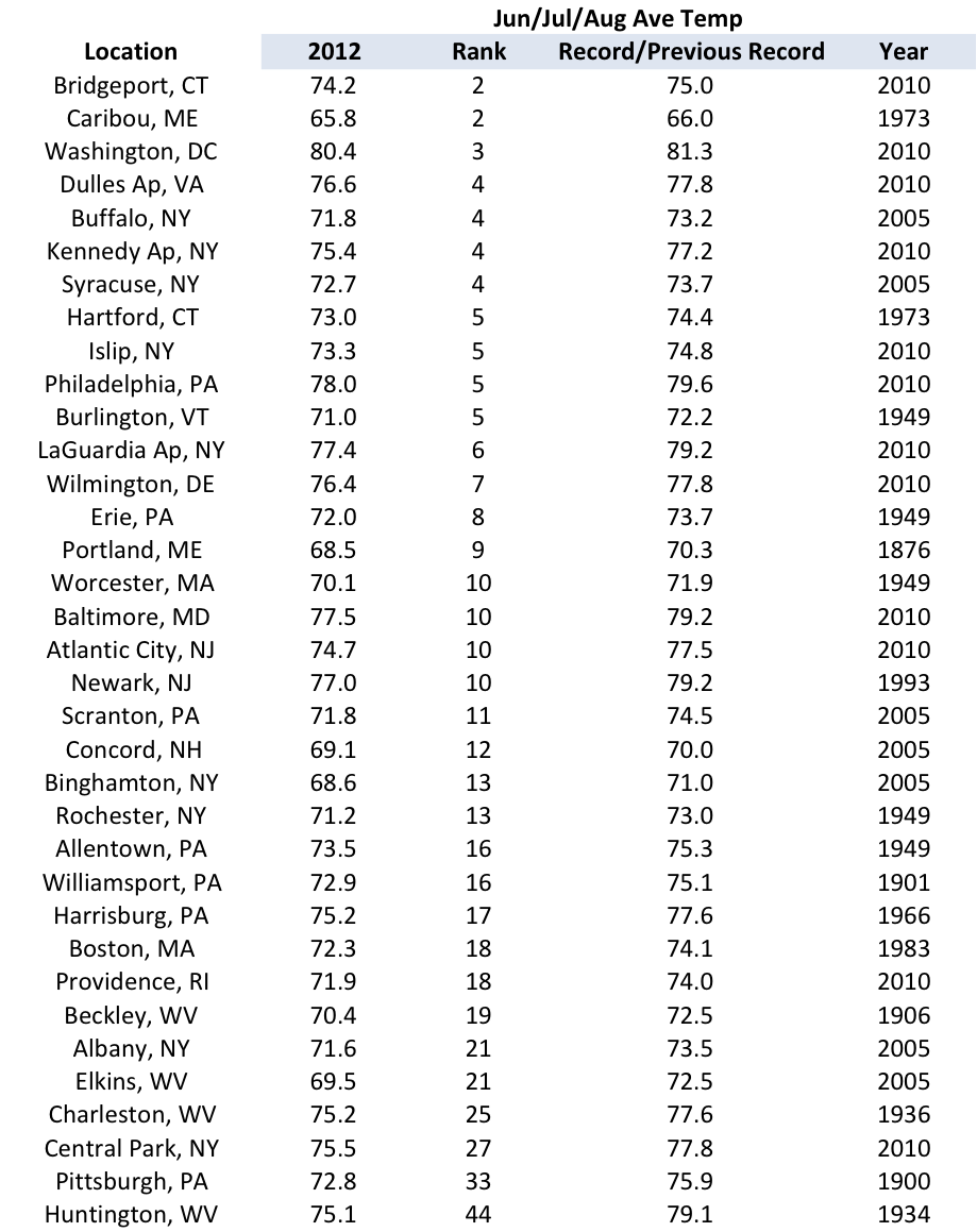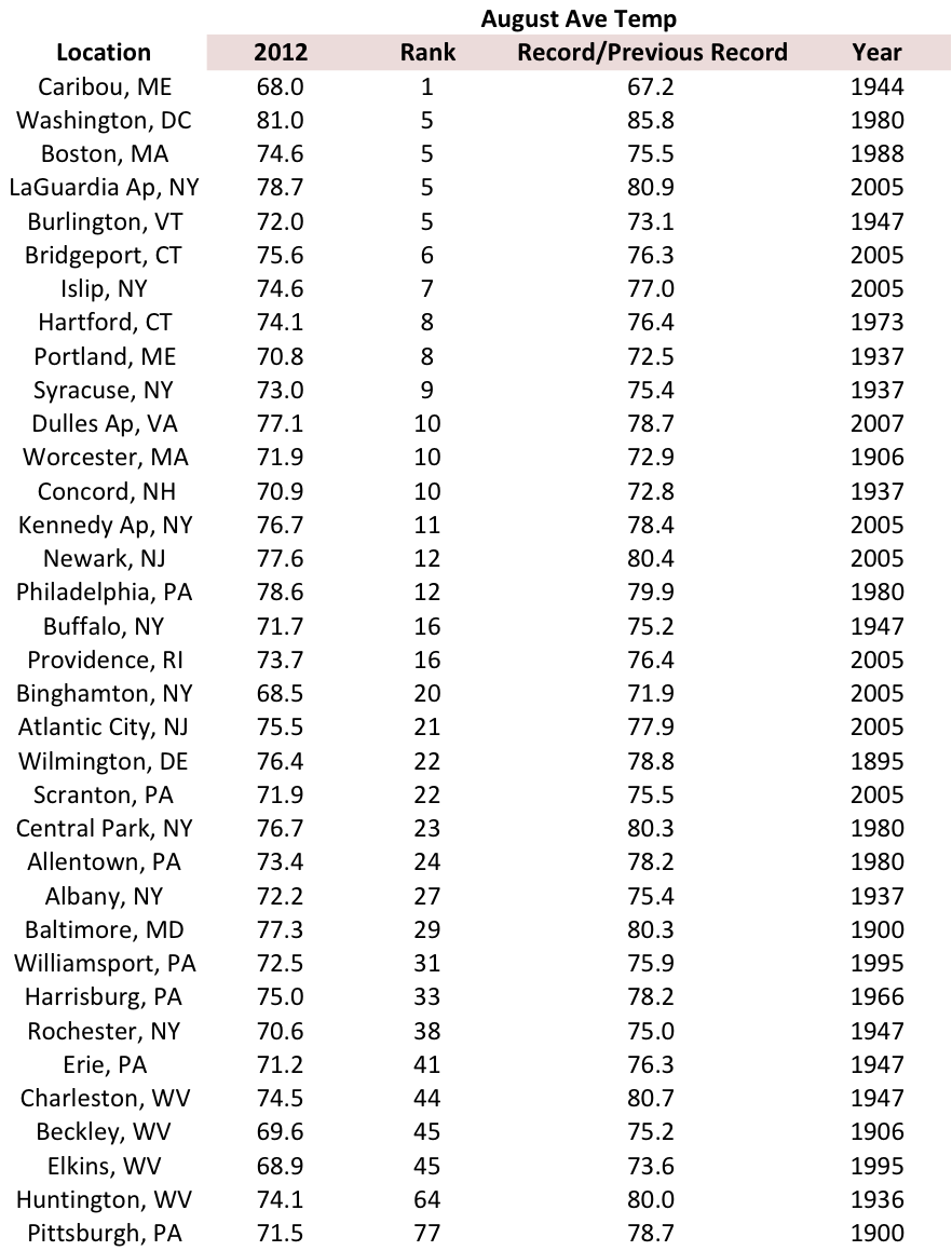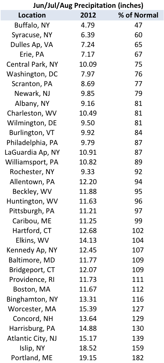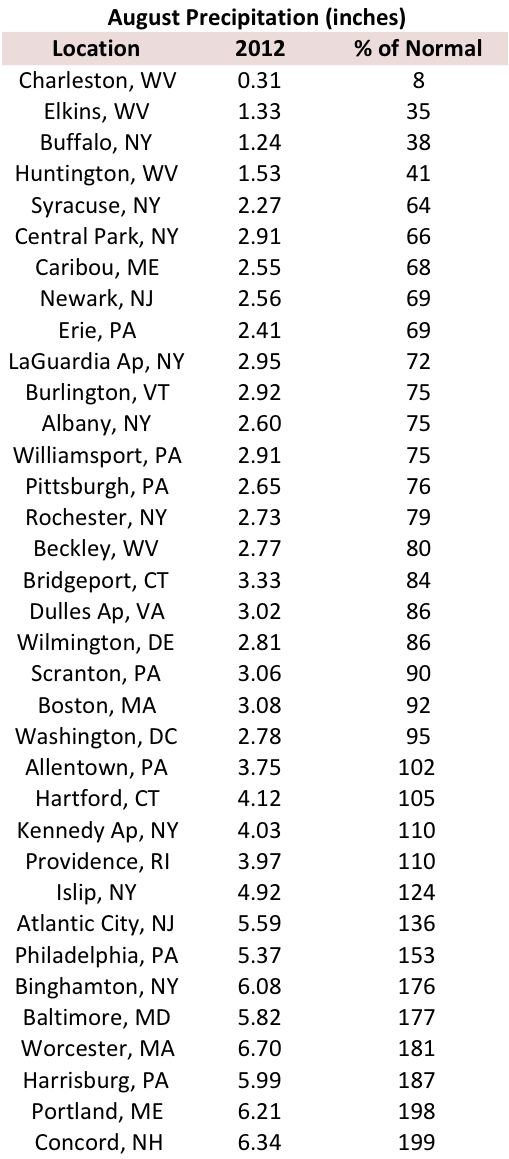 August and climatological summer (June through August) have come to an end and climatological fall (September through November) has begun! Caribou, ME had its warmest August on record while 12 additional First Order stations (out of 35 total) had August averages that ranked within the top ten warmest on record. Summer as a whole was warm, with 19 First Order stations having their top 10 warmest summers. There was quite a range of rainfall in August - Concord, NH had almost 200% of their normal amount but Charleston, WV had only 8% of their normal amount of rain. With only 0.31 inches of rain, it was Charleston’s driest August on record. Summer precipitation amounts have also varied throughout the region and while some areas have had sufficient rainfall, other areas are in severe drought.