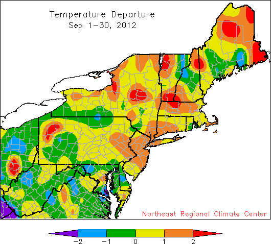 September averaged wetter than normal in most of the region, alleviating drought conditions in Massachusetts, New York, Delaware and Maryland. Temperatures averaged up to two degrees warmer than normal in most of the northern states and a degree or two below normal in West Virginia, Maryland and Delaware. There were a few severe weather events during the month including five confirmed tornadoes - one in Delaware, two in the New York City metro area, and two in southwestern Pennsylvania.