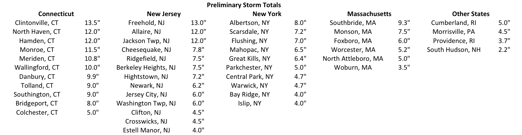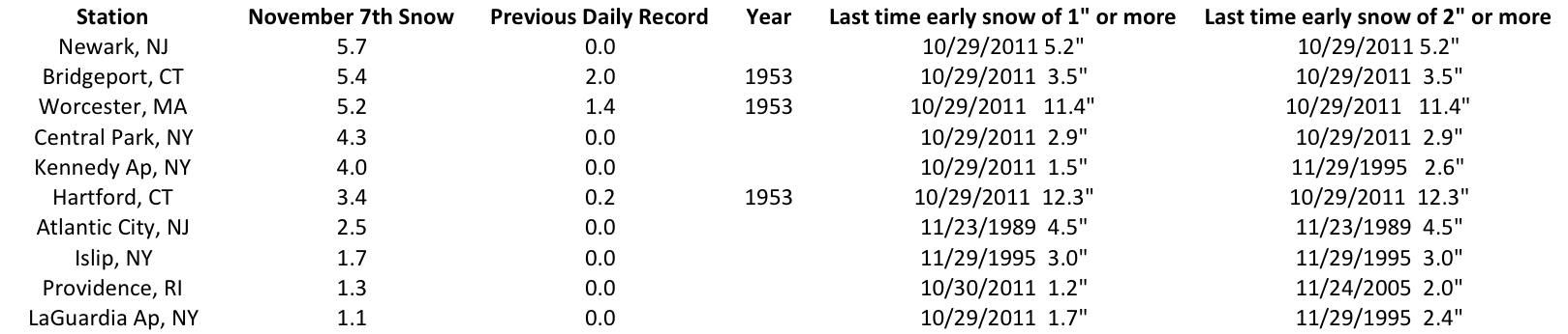 Snow blanketed areas in New Jersey, New York, Connecticut, Rhode Island and Massachusetts on November 7th with some storm snowfall totals exceeding a foot. Many communities are still in the early stages of recovery from Hurricane Sandy as an early season Nor’easter skirted the coast of the Northeast and brought wind gusts of 40-60 mph, snow and rain, coastal flooding, and below normal temperatures. Many daily snowfall records were broken, and it was the first time for snow to fall on November 7th at Newark, Atlantic City, Central Park, JFK, Islip, LaGuardia, and Providence since their record keeping began. It was also the earliest for this much snow to fall at Newark, Atlantic City, Bridgeport, Central Park, JFK and Islip. Early snowfalls aren’t unfamiliar to the Northeast - just last year on October 29th many stations had over an inch, again with some areas accumulating over a foot of snow.