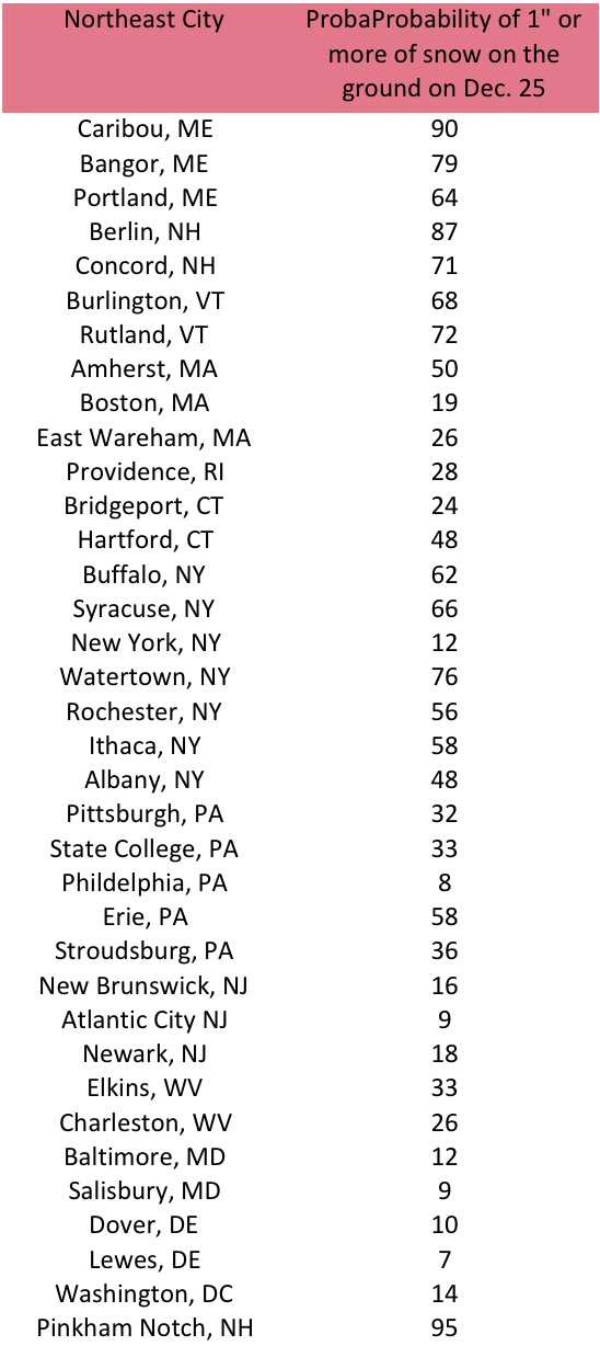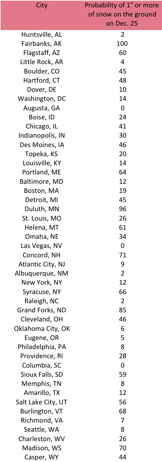 For those dreaming of a white Christmas it’s practically guaranteed in Fairbanks, Alaska, where there has been an inch or more of snow on the ground every Christmas for the past 50 years. What about the contiguous U.S. you ask? There’s a 96% chance of celebrating the holiday in a winter wonderland in Duluth, Minnesota. In the Northeast, it’ll be lovely weather for a sleigh ride together in Pinkham Notch, New Hampshire, where there’s a 95% chance of an inch or more of snow on the ground on the 25th. And as for New York, Watertown’s where it’s at… the snow that is! The city has a 76% chance of having a white Christmas.