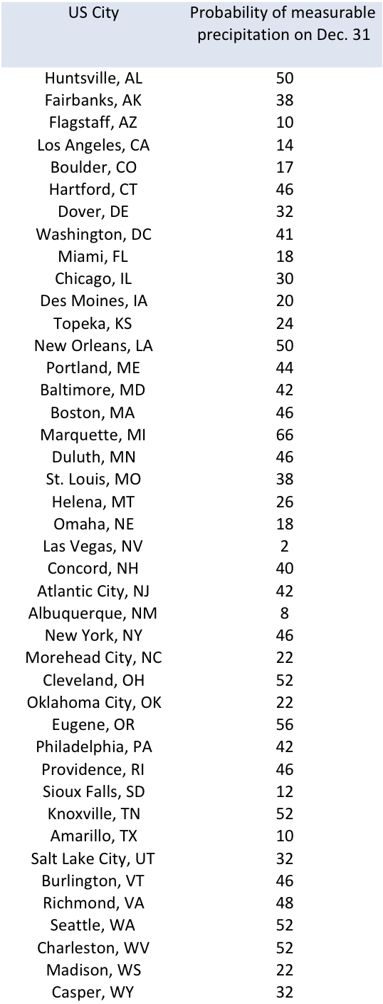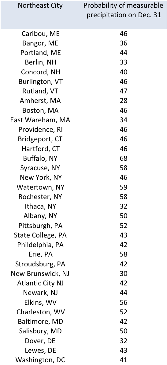 If you’re looking to stay dry while ringing in the New Year, gamble on Las Vegas, Nevada, where there’s only a 2% chance of measurable precipitation. Coastal hotspot Miami, Florida, may have a lot of water nearby, but it doesn’t have much falling from the sky on New Year’s Eve with only an 18% chance of precipitation. How does the ultimate destination, New York City, fair? Well, there’s a 46% chance it’ll rain, or snow, on your New Year’s Eve parade in the Big Apple. See our list of Northeast and US stations!