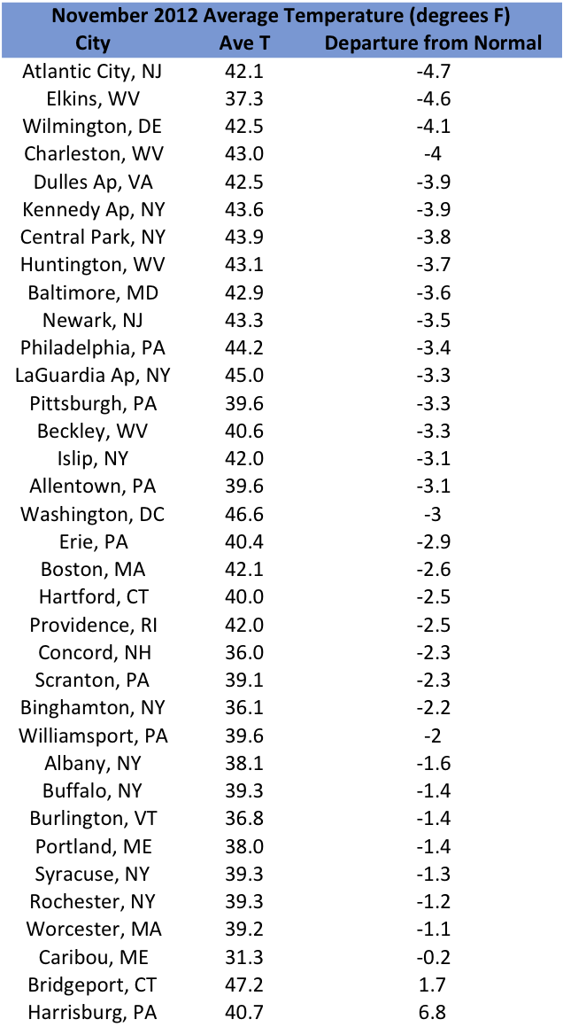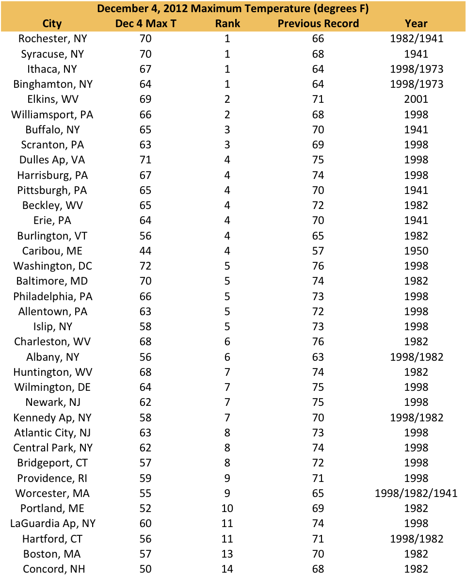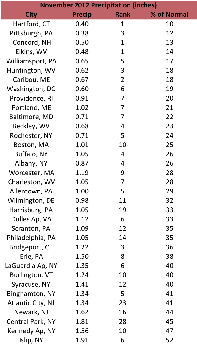 November 2012 went into the record books as the 2nd driest since 1895, with the region receiving only 1.04 inches of precipitation (27 percent of normal). The record driest November was 1917 when the Northeast received only 0.88 inches of precipitation. All states and First-Order Stations were drier than normal. For the first time since October 2009, all states reported below average temperatures, as did most of the First-Order Stations. With an average temperature of 37.2°, the Northeast was 2.5° cooler than normal and the coolest November since 1997. November’s coolness did not linger into December, though. On December 4th, southerly air in advance of a cold front pushed temperatures to near-record warmth or, for a few New York cities, record warmth.
