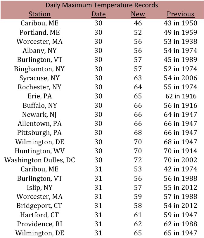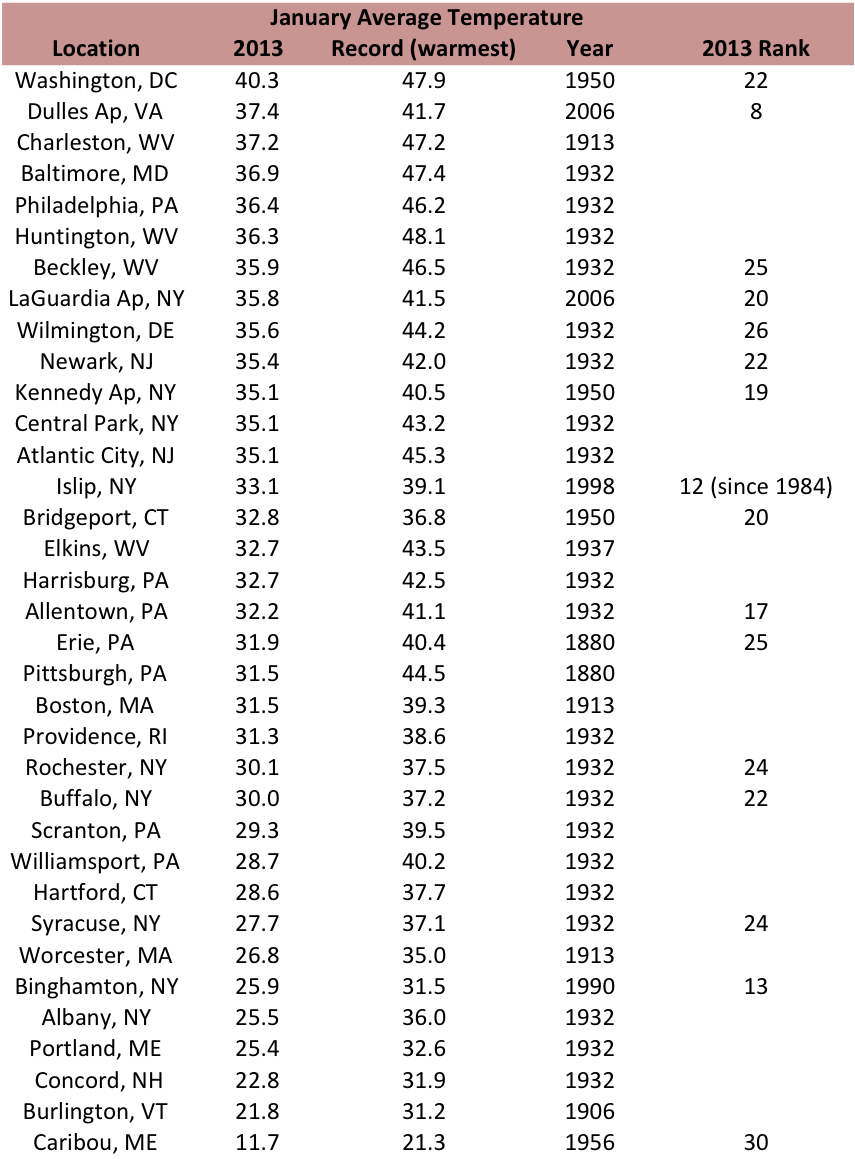 An Arctic chill from the 22nd through the 25th dropped temperatures 15-20° below normal. Just a few days later, from the 30th through the 31st, twenty sites set record highs. Despite the rollercoaster ride of temperatures the last 10 days of the month, January ended warmer than normal at all first-order stations. In fact, January 2013 ranked in the top 30 warmest for several sites including Dulles Airport which had its 8th warmest January on record.