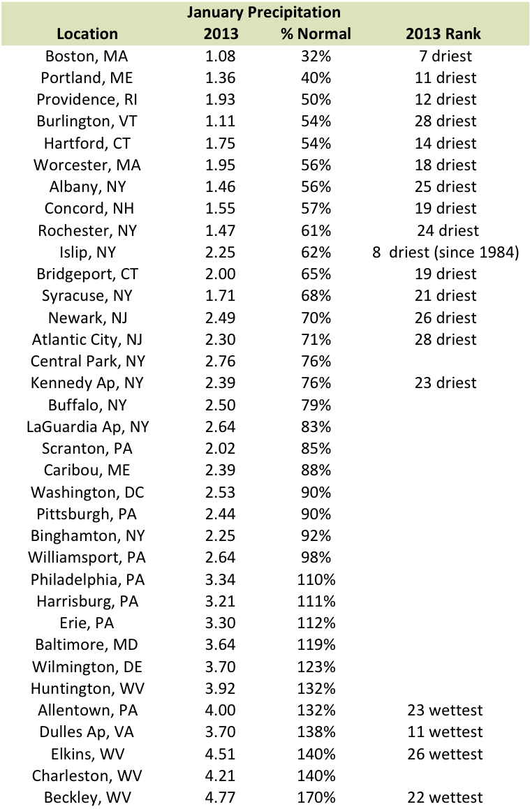 The first nine days of January were dry across much of the Northeast. That precipitation deficit was hard to over come as 24 climate stations were drier than normal for the month. Boston, MA, was the driest site at 32 percent of normal, their 7th driest January. The other 11 stations were wetter than normal with the wettest being Beckley, WV, at 170 percent of normal, their 22nd wettest January on record.