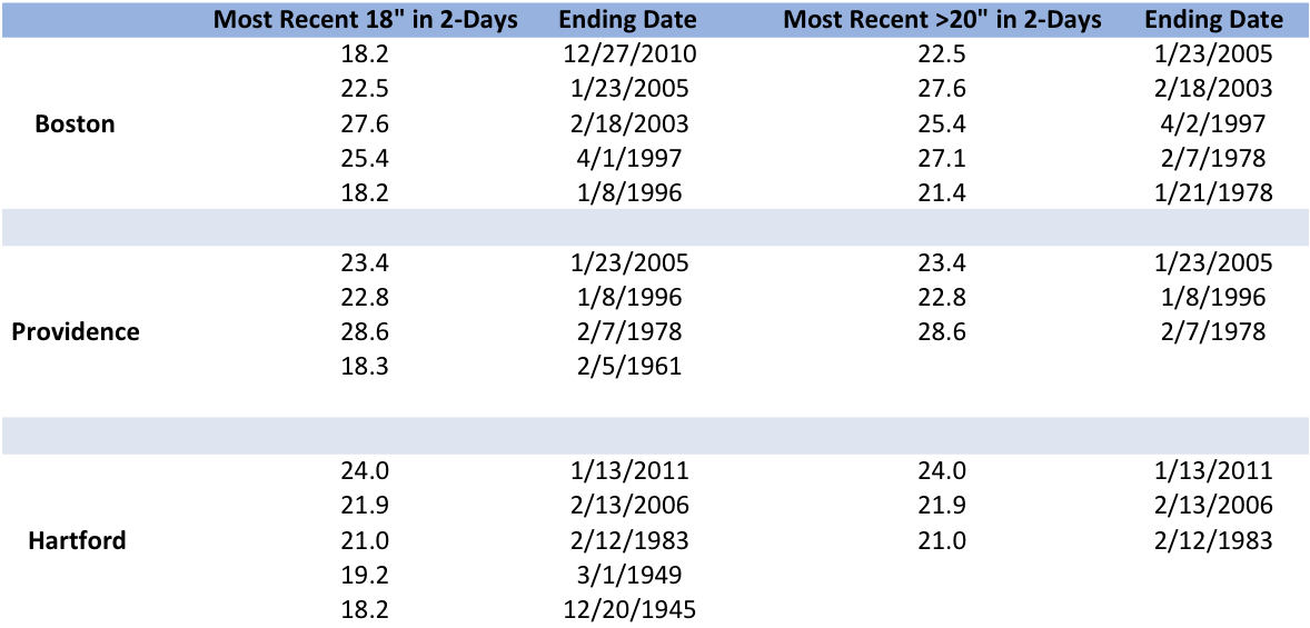 The Northeast is about to be impacted by a major winter storm. Winter storm watches and warnings, as well as blizzard warnings, have been issued for this Friday into Saturday. The Boston National Weather Service is expecting accumulations of 18-24 inches for their forecast area, which includes Providence, RI and Hartford, CT. This isn’t unheard of, but when was the last time these cities had so much snow in two days? The last time Boston had at least 18 inches was in 2010, the last time more than 20 inches fell was in 2005. Providence hasn’t had 18 or 20 inches over two days since 2005. Hartford on the other hand had 24 inches in a January 2011 snow event. You may also want to check out the current top 5 records for 1-day and 2-day snowfall totals.