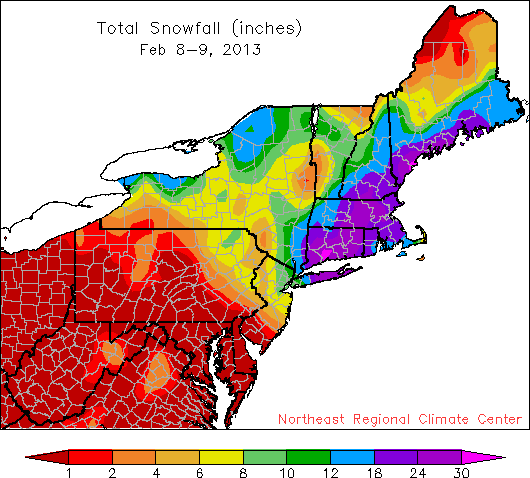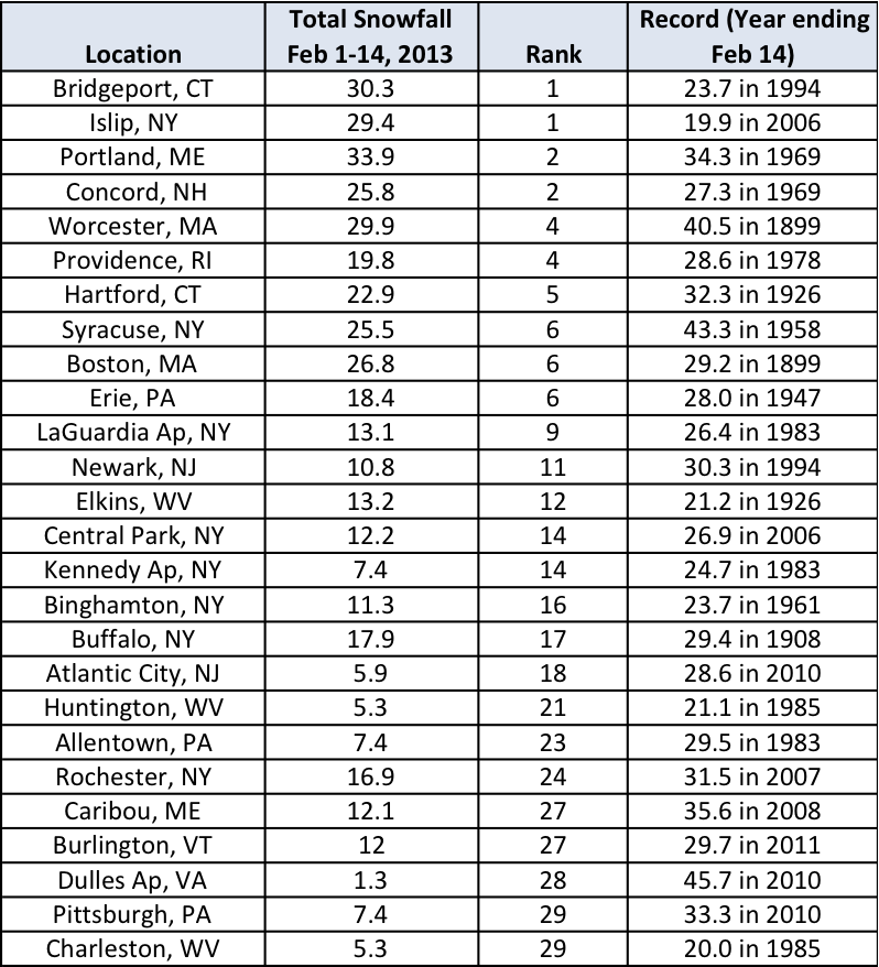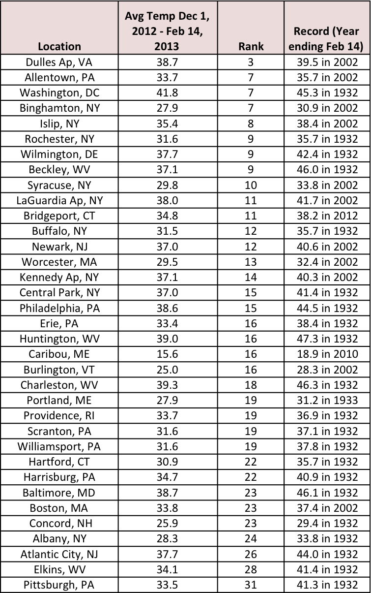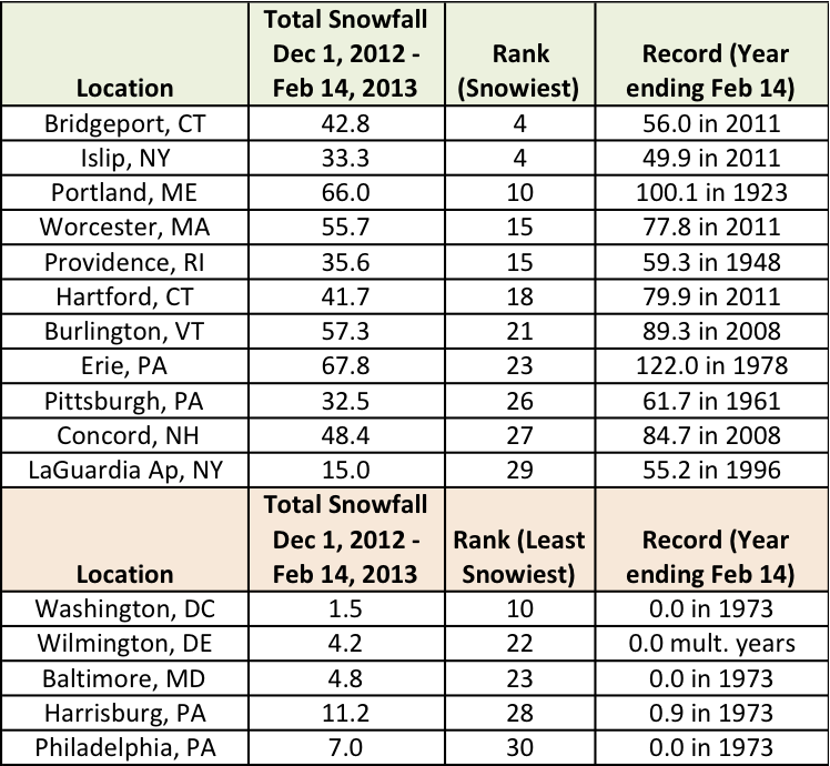 With only two weeks left in meteorological winter, the season is shaping up to be a warm one across the Northeast. From December 1, 2012 through February 14, 2013 the average temperature at 34 of 35 climate sites ranked in the top 30 warmest. As for snowfall, Feb 1-14, 2013 was one of the top 30 snowiest at 26 sites. That’s in large part due to the February 8-9th storm that dropped up to 40" of snow on the Northeast. When examining winter so far, 11 sites report the season to be one of their snowiest while 5 sites report it to be one of their least snowiest.