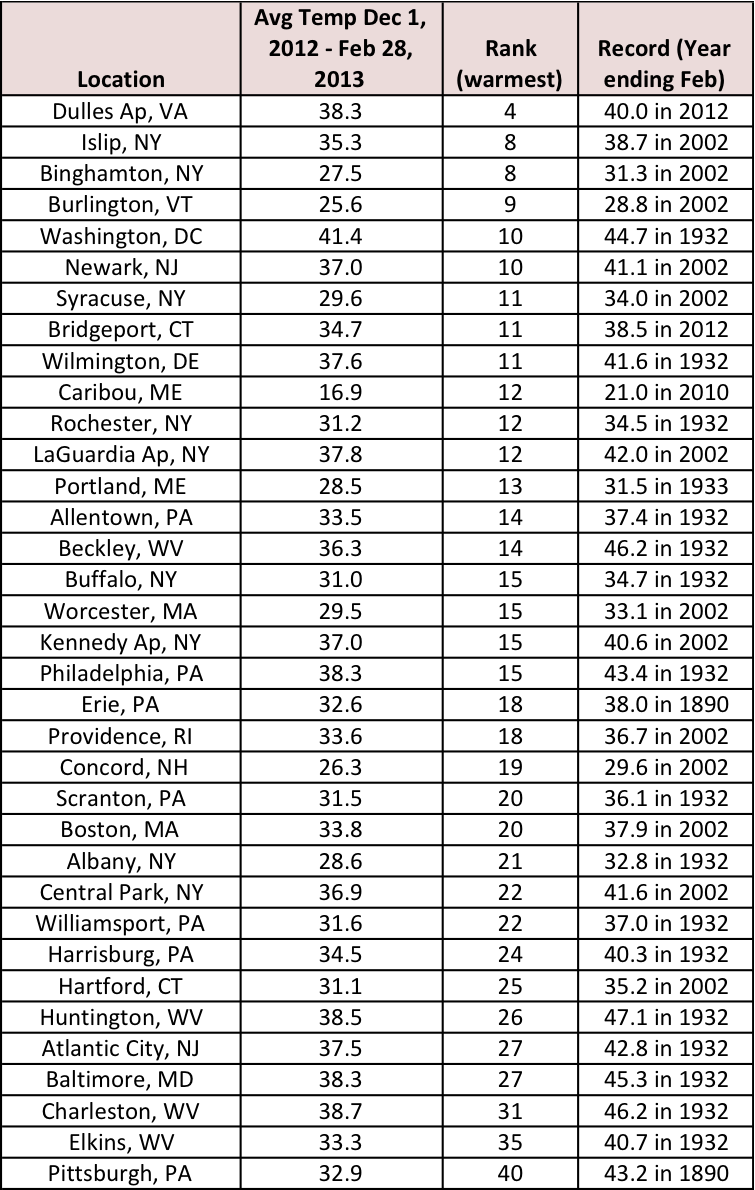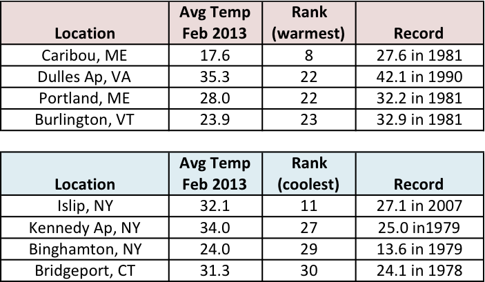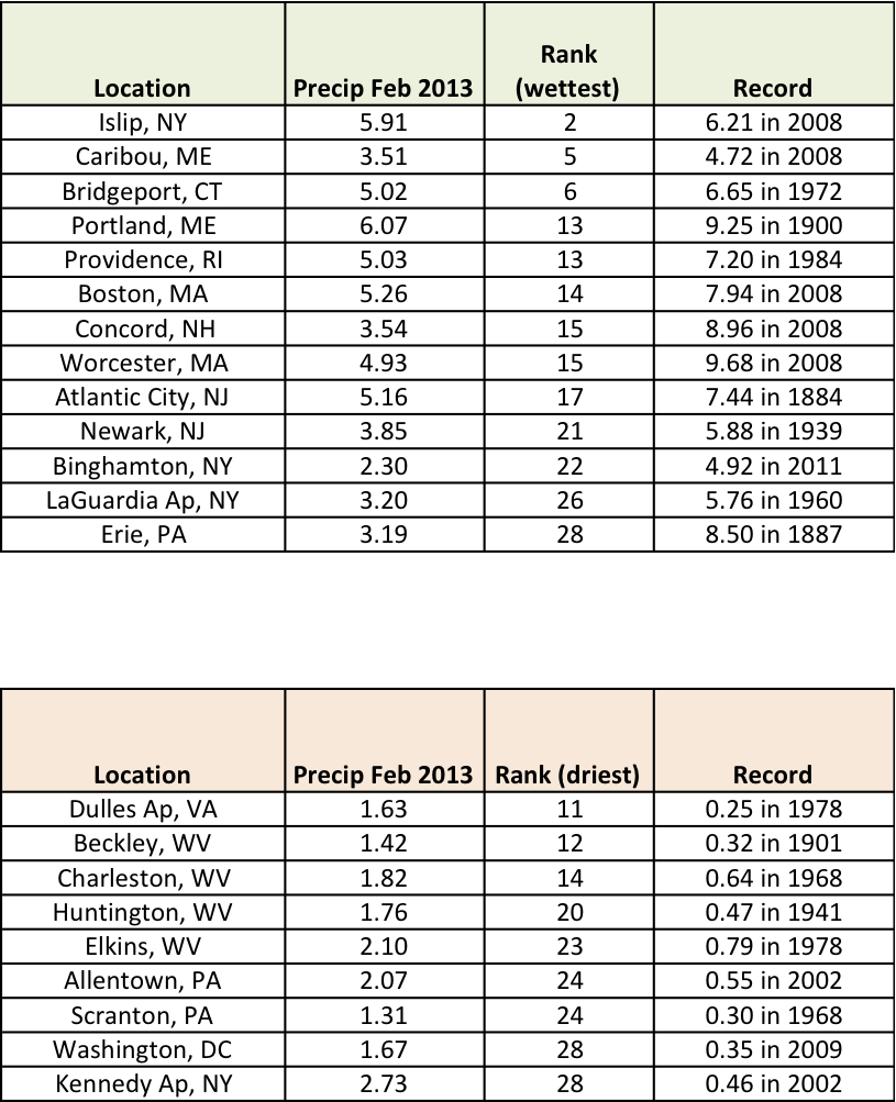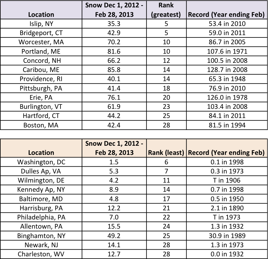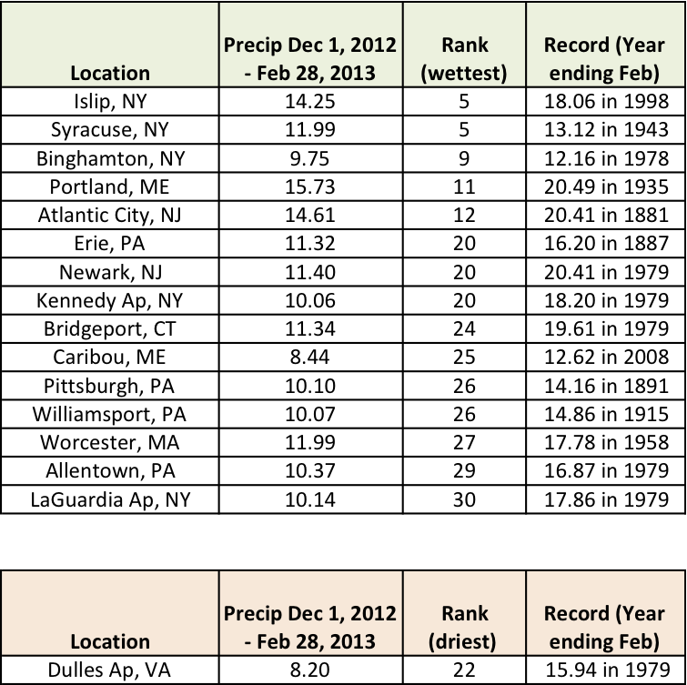 Despite February temperatures hovering near normal for most of the Northeast, winter 2012-13 ranked as one of the top 27 warmest at 32 of 35 first-order climate sites. Total precipitation was hit-or-miss as 9 sites ranked February as one of their 28 driest while 13 ranked it as one of their 28 wettest. February was particularly snowy for 19 cities due mainly to a large storm early in the month. While winter tended to be wetter than normal (it ranked as one of the top 30 wettest for 15 sites), it wasn’t necessarily snowier. Winter snowfall was split with 12 sites having one of their top 28 snowiest winters and 11 sites having one of their top 28 driest.