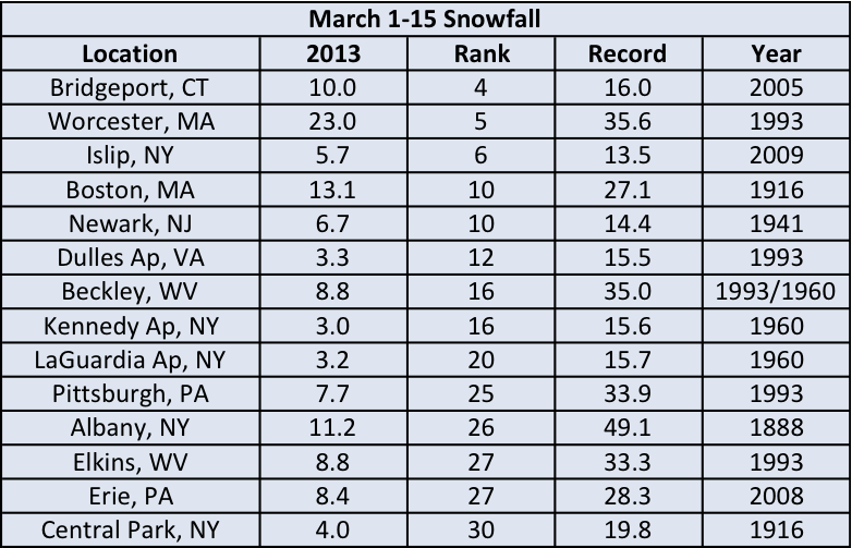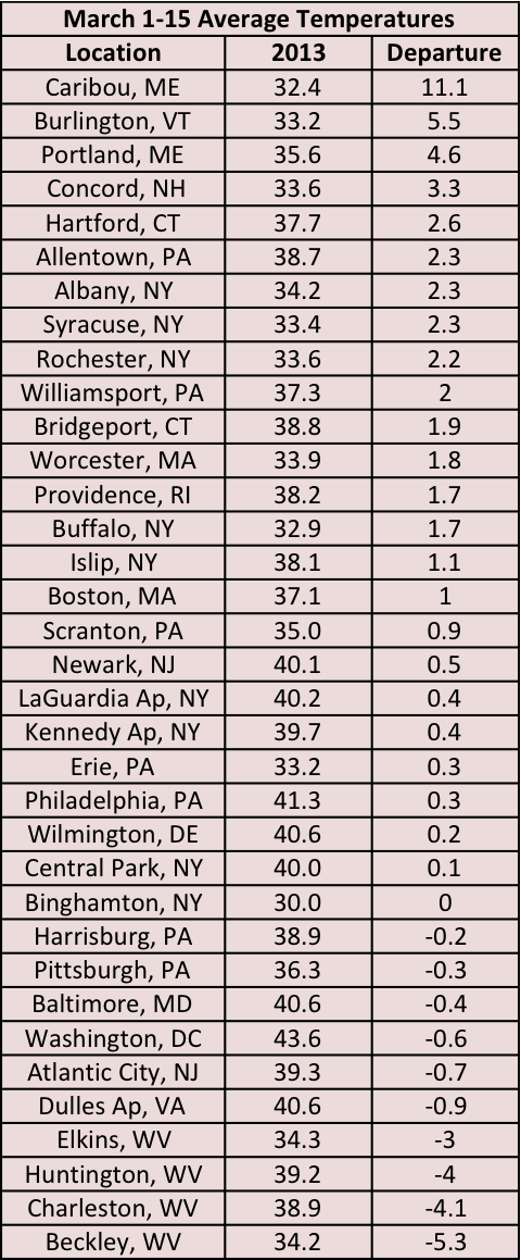 When examining data from March 1-15, 14 of 35 climate sites ranked 2013 in their top 30 snowiest. Most of the snowy sites were hit by a storm that moved across the Mid-Atlantic and along the East Coast from the 6th to the 8th. Despite some sites receiving plenty of snow, overall precipitation in the Northeast was slim. Examining the same March 1-15 period, 2013 ranked in the top 30 driest at 19 sites. As for temperatures, 24 sites were above normal while 10 were below normal. Northern New England was particularly warm with Caribou, ME, averaging 11.1° above normal. On the other hand, West Virginia and Maryland were cool with Beckley, WV, averaging 5.3° below normal.