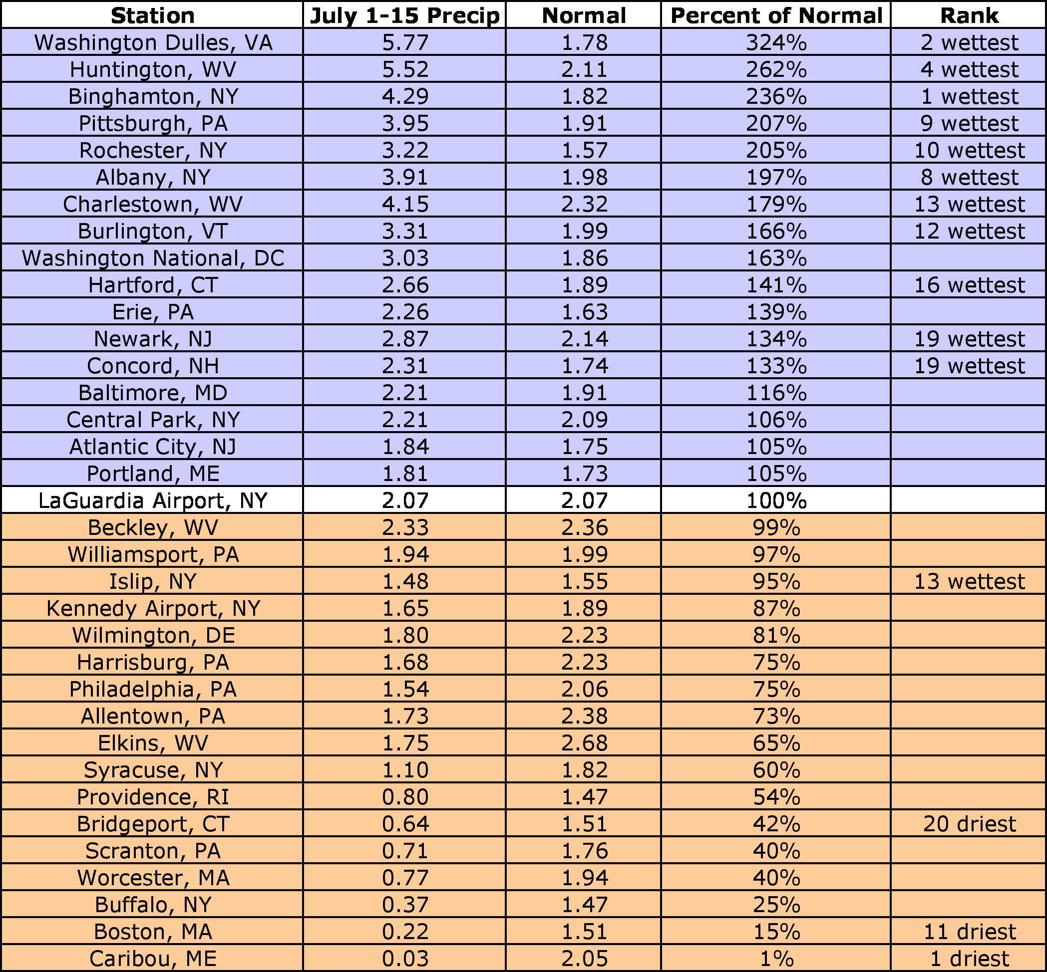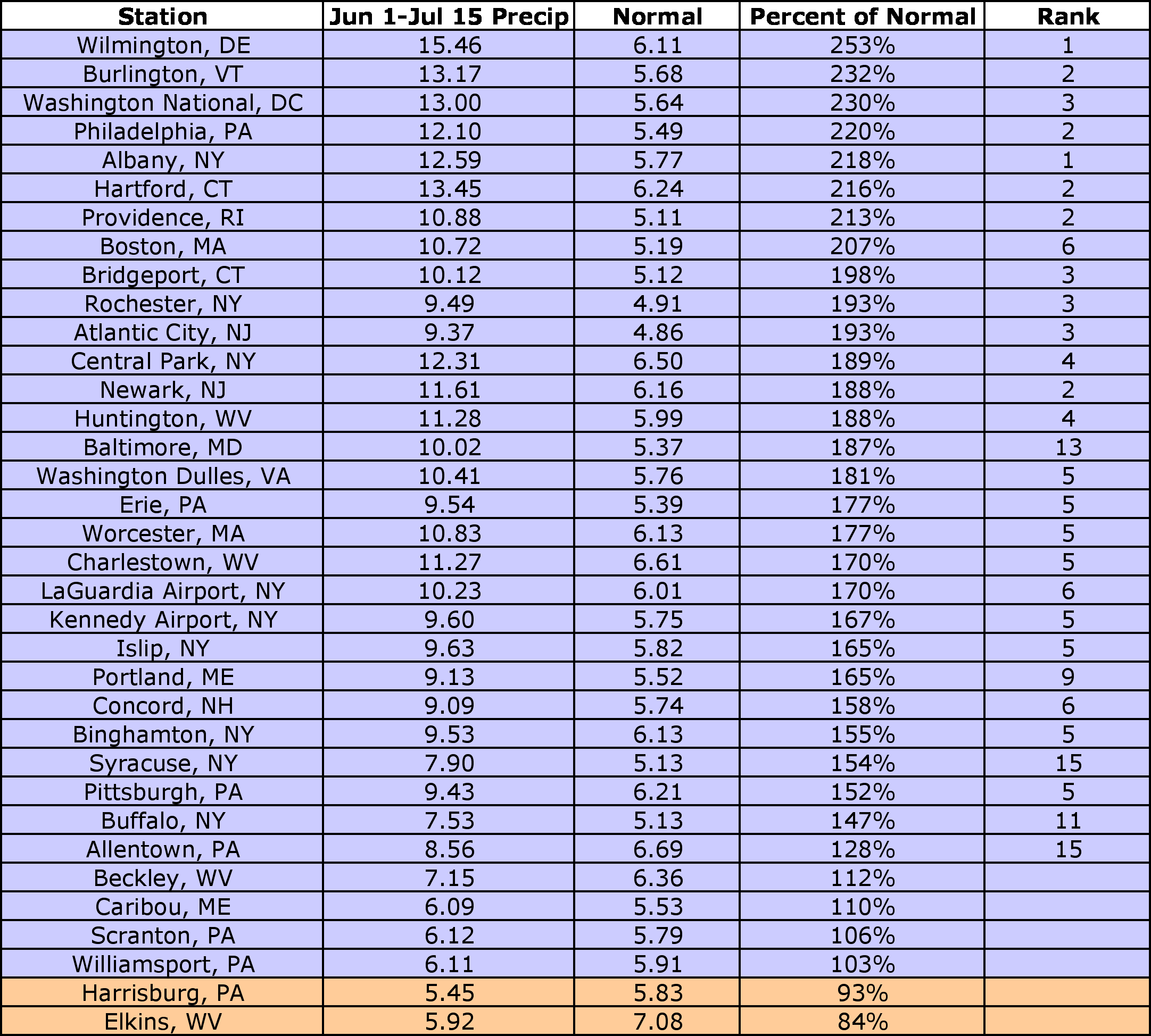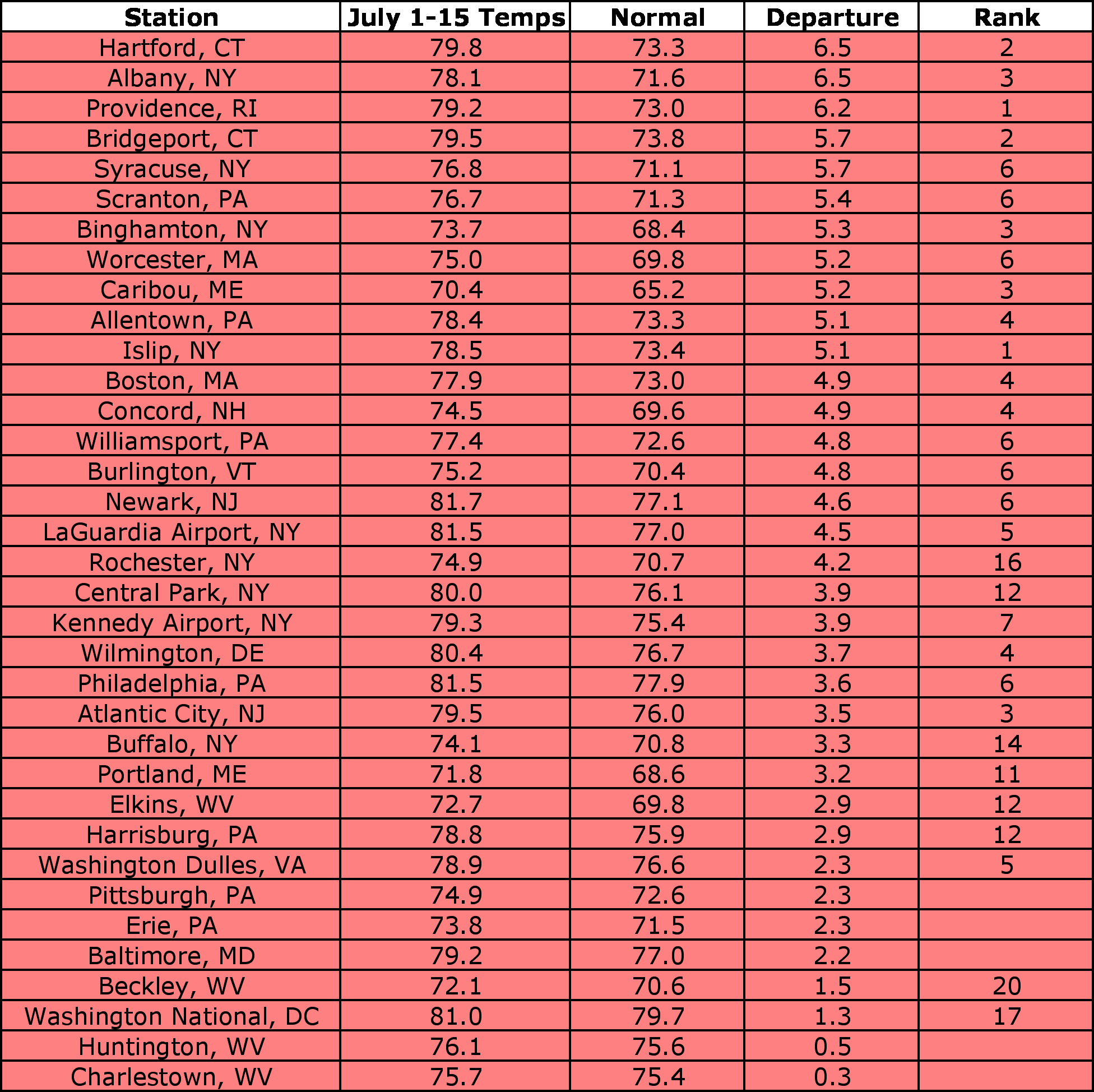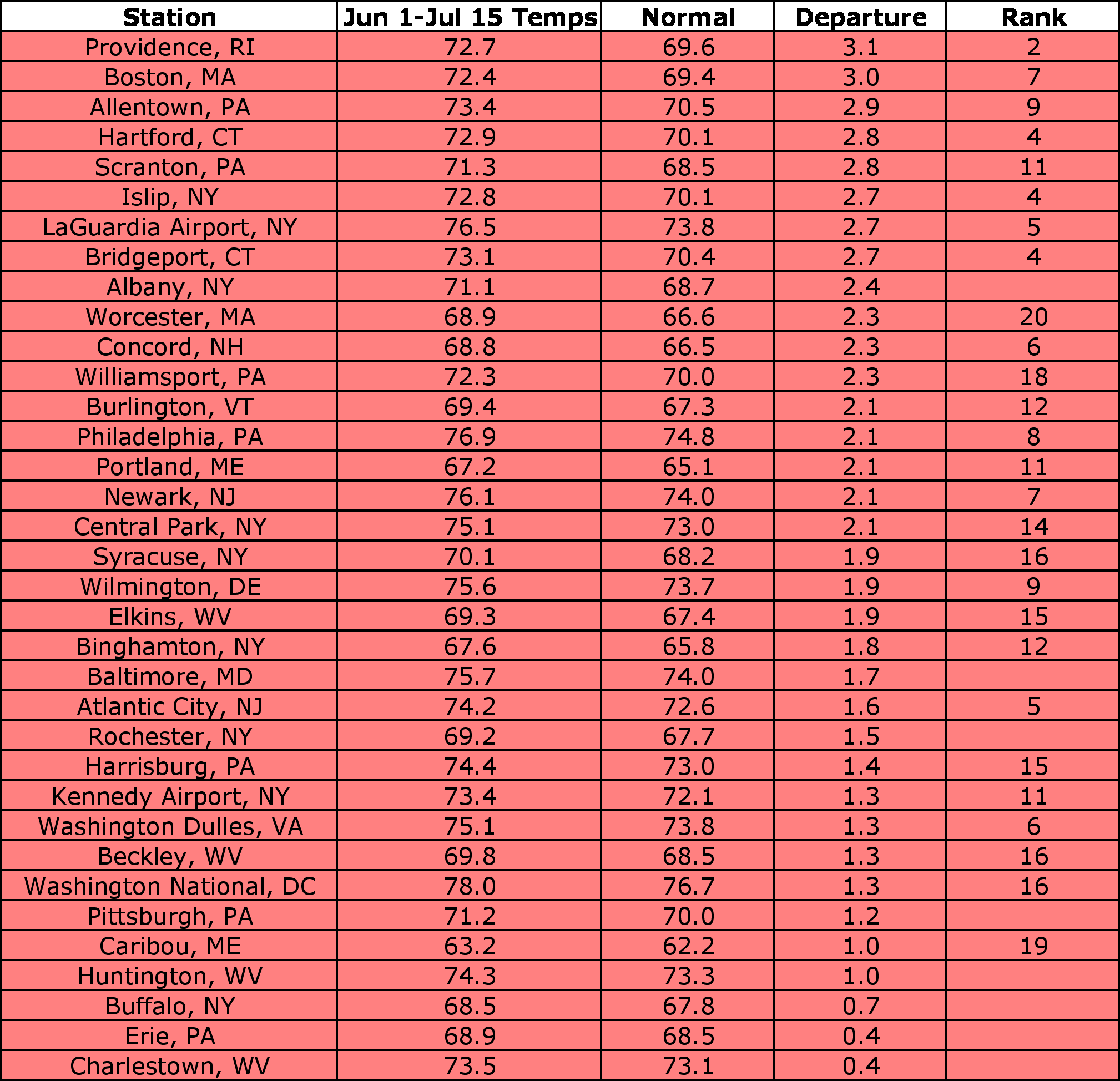 The first two weeks of July were warmer than normal at all 35 first-order climate sites. When looking at data from July 1-15, 30 sites ranked the first half of July 2013 as one of their top 20 warmest. In fact, Providence, RI, (+6.2 degrees) and Islip, NY, (+5.1 degrees) ranked the first two weeks of July 2013 as their warmest on record. When expanding to June 1 through July 15, all 35 sites were warmer than normal with 27 sites ranking the first half of Summer 2013 among their top 20 warmest.