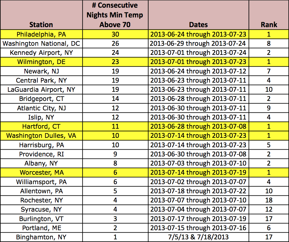 While many sites had consecutive days with high temperatures above 90 degrees, warm low temperatures were another contributor. Five climate sites set records for consecutive number of nights (some extending back to June) with a minimum temperature above 70 degrees. For example, Philadelphia, PA, had 30 straight nights where the temperature did not drop below 70 degrees.