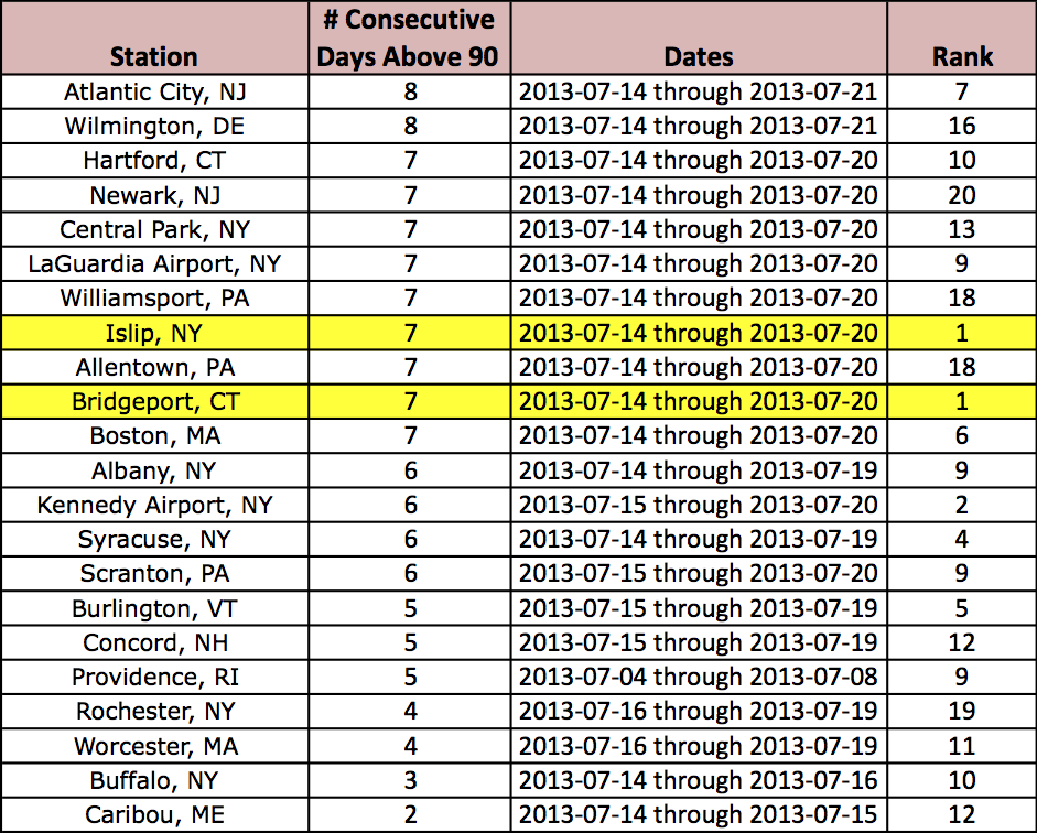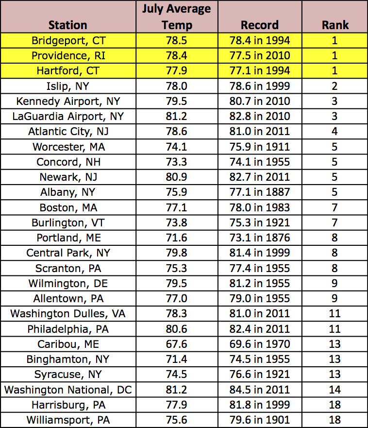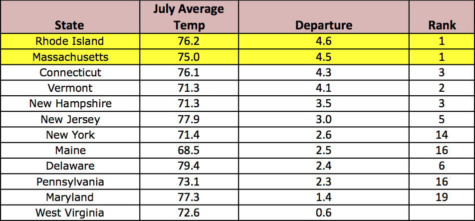July 2013 was a warm one in the Northeast. Eleven of the twelve Northeast states ranked this July among their top 20 warmest with Rhode Island and Massachusetts having their warmest July on record. Twenty-six of the thirty-five first order sites ranked this July among their top 20 warmest, with three sites setting monthly temperature records.