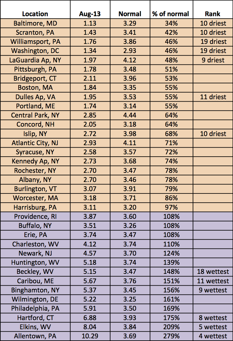 August was quite dry at some sites and quite wet at others. Twenty-one first-order climates sites wrapped up the month with below-normal precipitation while 14 sites were wetter than normal. Looking at summer, 33 of the 35 sites had a wetter-than-normal summer, with 22 sites ranking this summer among their top 20 wettest. In fact, Philadelphia had its wettest summer on record, beating its old summer record by 5.13 inches.