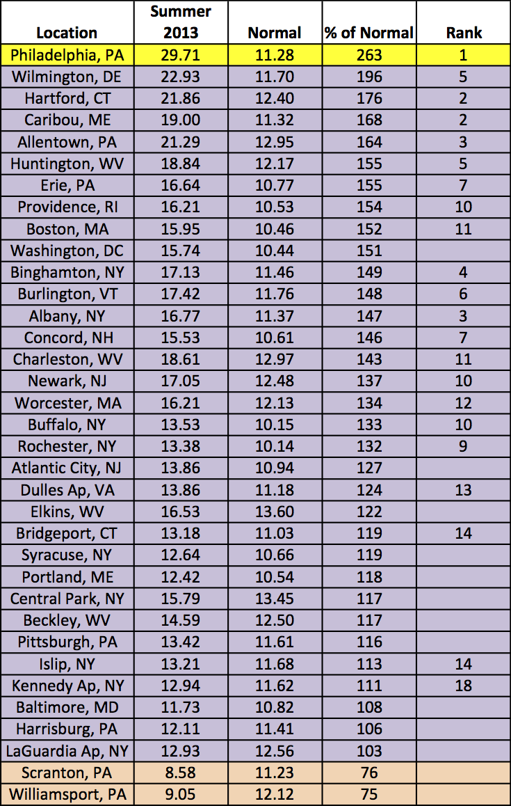 Almost the entire region saw more than 110% of normal summer precipitation, except for parts of Pennsylvania and New York.