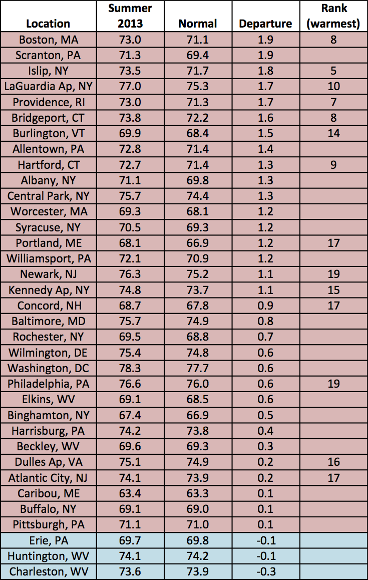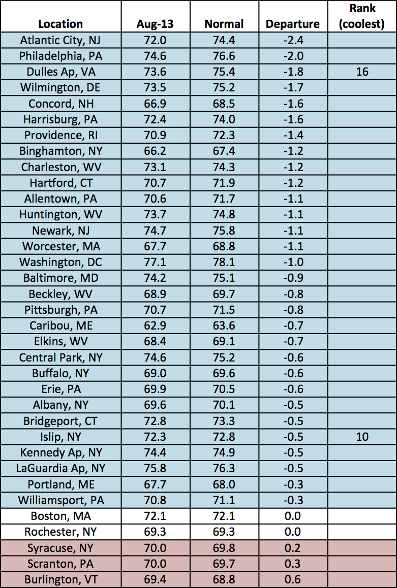 Following two warmer-than-normal months, August featured below-normal temperatures for the majority of the Northeast. Of the 35 first-order climate sites, 30 were cooler than normal during August. Expanding to summer, the coolness of August was not enough to balance the heat of June and July as 32 of the climate sites experienced a warmer-than-normal summer.