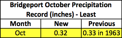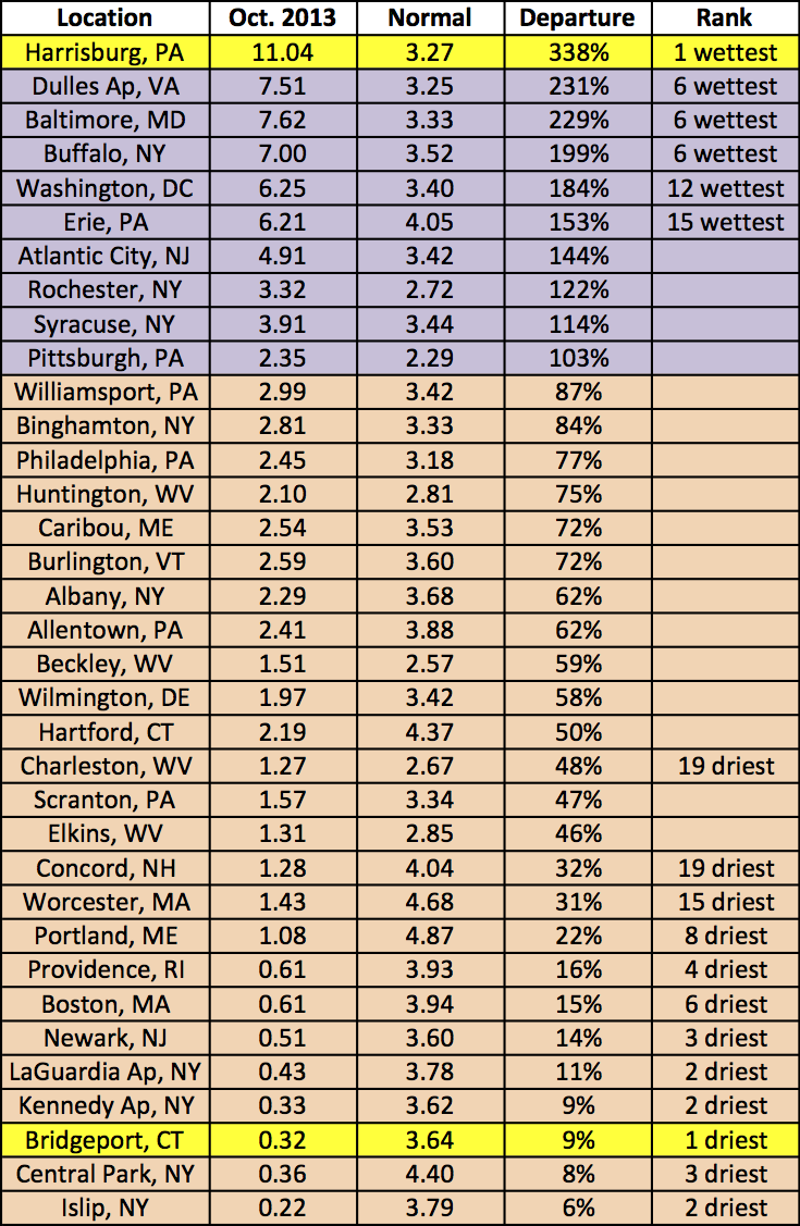 October played tricks on many cities with regards to precipitation. Some areas, like Harrisburg, PA, were waterlogged. With a whopping 338 percent of normal, the site saw its wettest October on record. Other areas, like Bridgeport, CT, were bone-dry. Receiving a scant 9 percent of normal, the site had their driest October on record. Overall, 25 of the 35 first-order climate sites were drier than normal, with 12 of the dry sites ranking this October among their top 20 driest and 6 of the wet sites ranking this October among their top 20 wettest. While abnormal dryness was present at the start of the month, areas of moderate drought were introduced by the end of the month. Check out the U.S. Drought Monitor for more details.