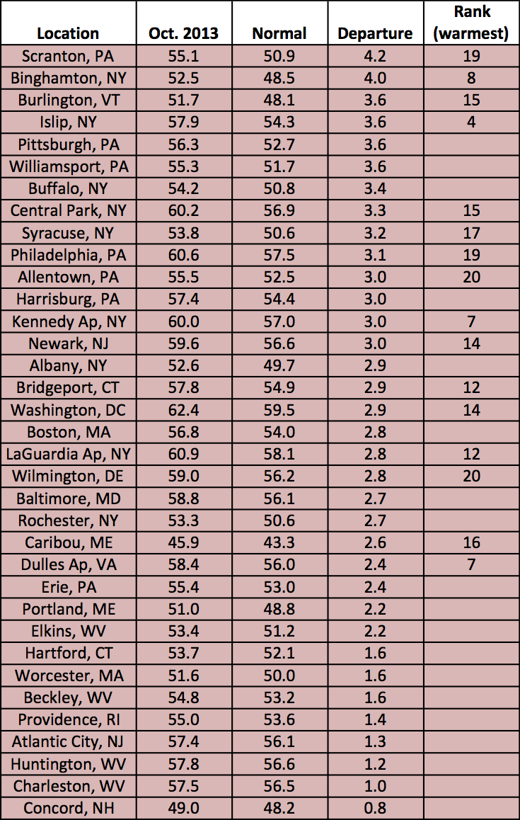 October treated most areas equally when it came to temperature. All 35 first-order climate sites were warmer than normal, with 16 sites ranking this October among their top 20 warmest. Departures ranged from +0.8 degrees in Concord, NH, to +4.2 degrees in Scranton, PA.