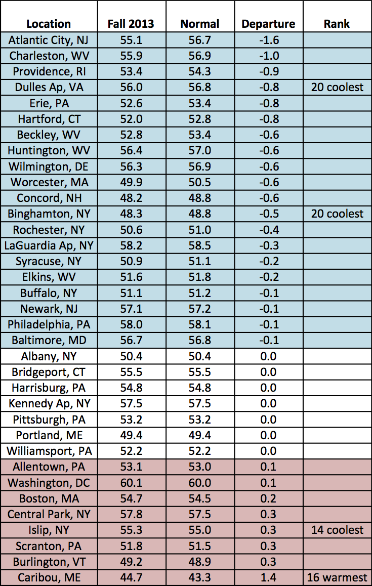 It was a cooler-than-normal November at all 35 first-order climate sites, with fifteen ranking the month among their top twenty coolest. With a cool September, warm October, and cool November, fall shaped up to be within one degree of normal at all but two sites.