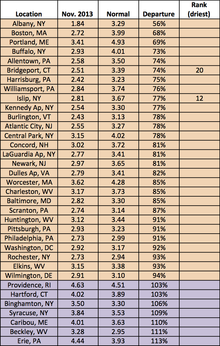 Of the 35 climate sites, 28 sites received below-normal precipitation during November, with drought conditions persisting or worsening in several areas. A storm near Thanksgiving pushed snow totals above normal in some areas but overall 23 sites received below-normal snowfall for the month. Looking at fall, 27 sites were drier than normal, with ten ranking the season among their top twenty driest. On the other hand, of the eight wetter-than-normal sites, five ranked this fall among their top 20 wettest.