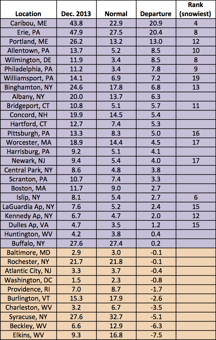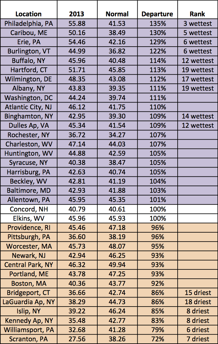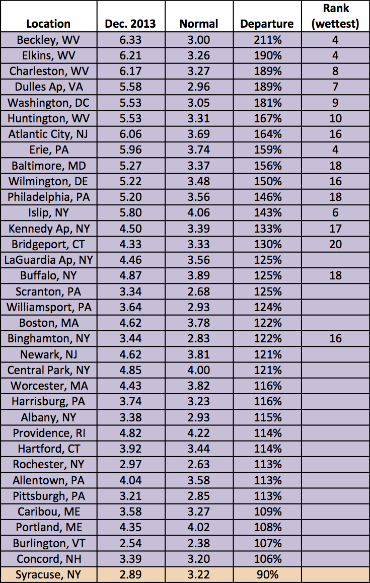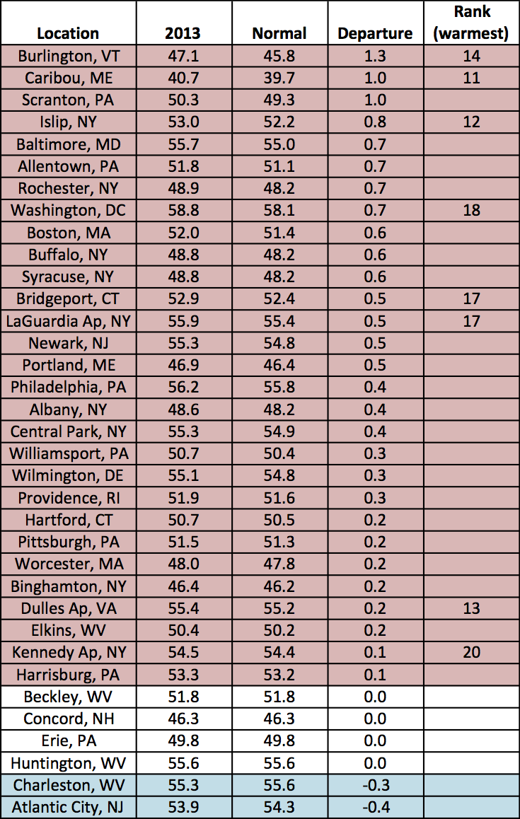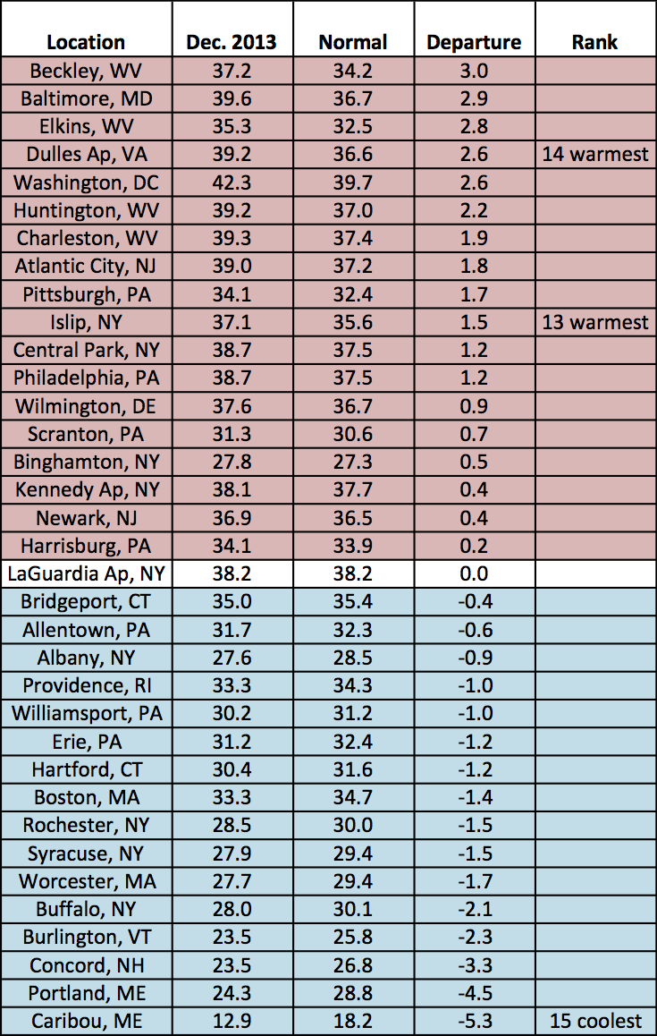 December featured opposite extremes in temperature as the 35 first-order climate sites were nearly split between above- and below-normal temperatures. Departures ranged from +3.0 degrees in Beckley, WV, down to -5.3 degrees in Caribou, ME. The ups and downs in temperature through 2013 averaged out so that 34 sites wrapped up the year within one degree of normal. Eight sites even ranked 2013 among their top 20 warmest.