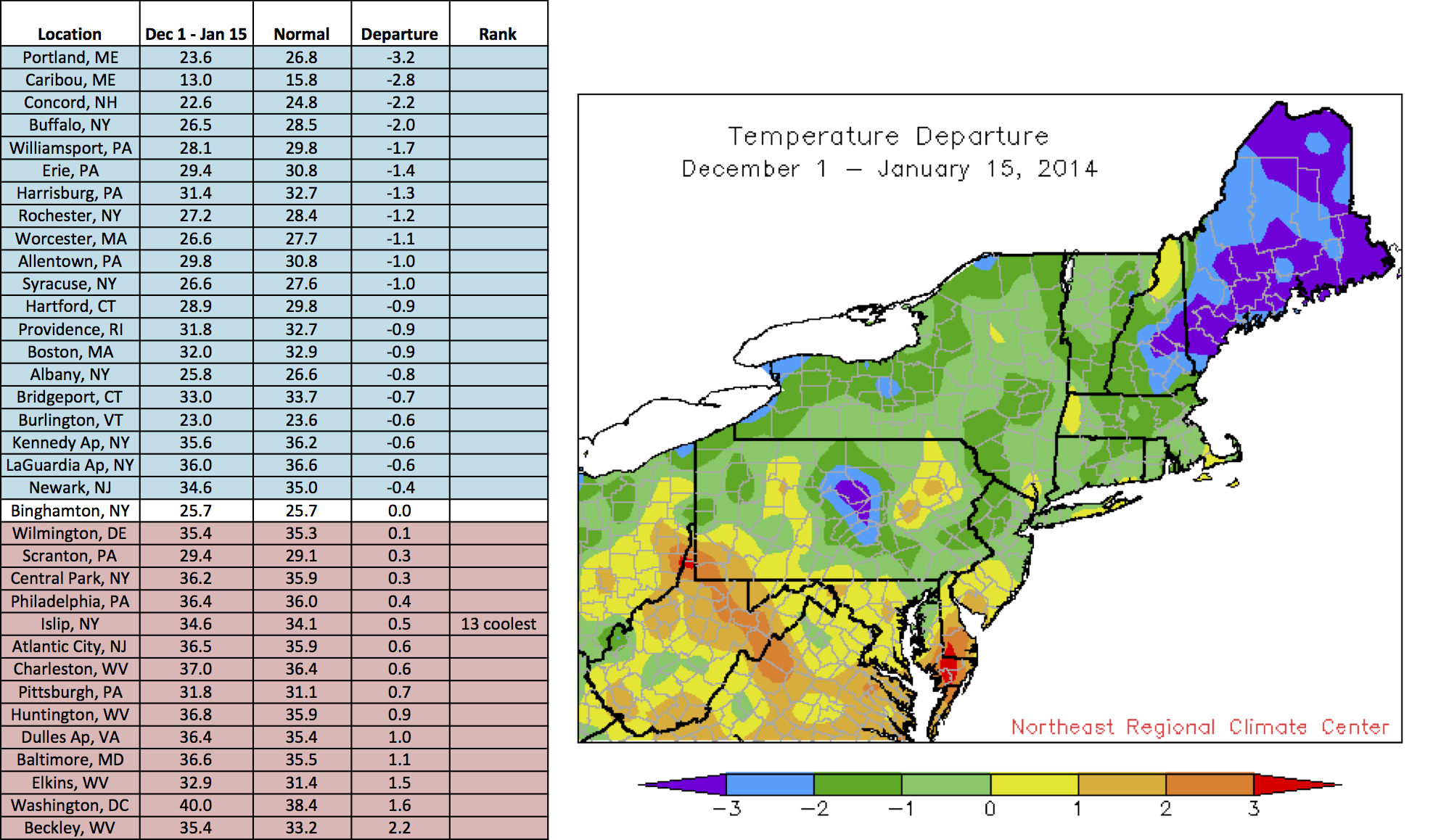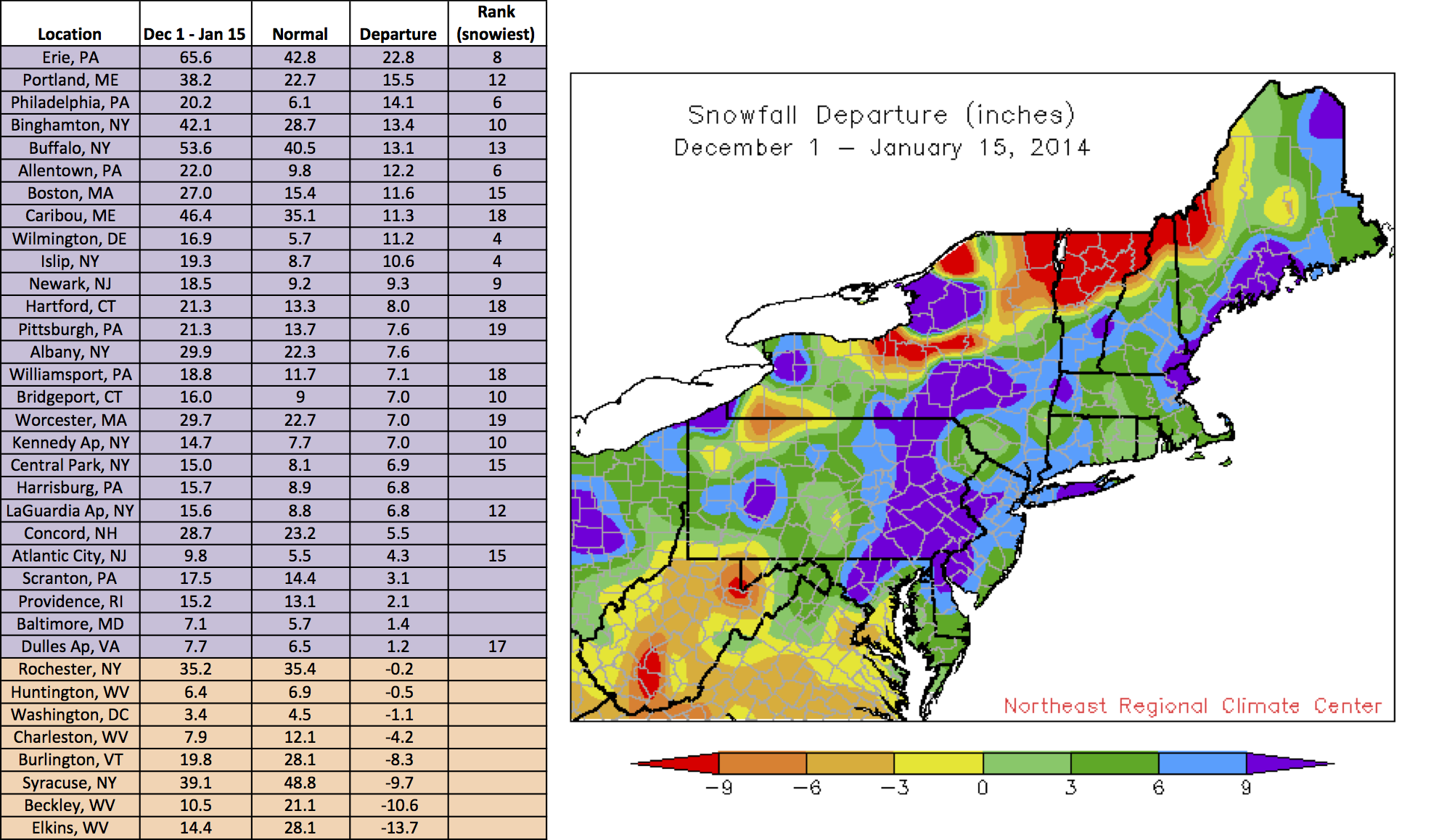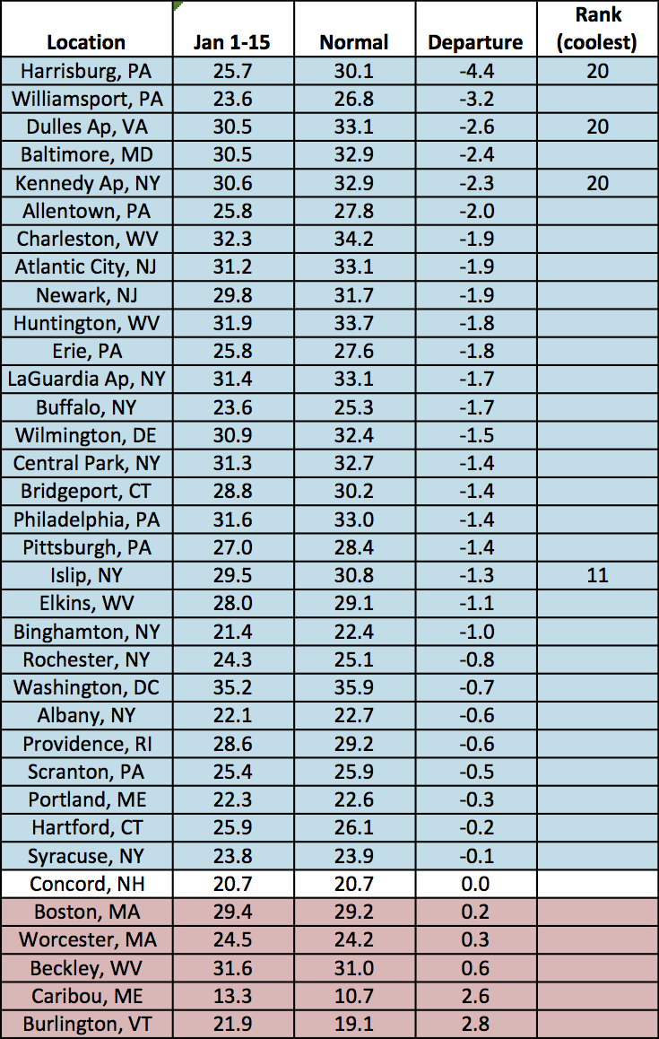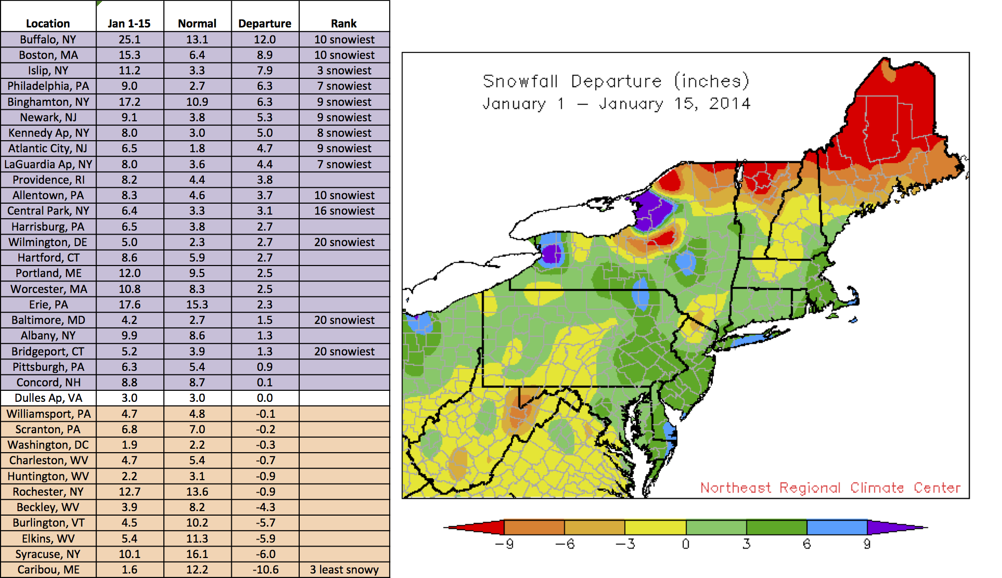 As you may have guessed from spending any time outside, January so far has been cooler and wetter than normal for much of the Northeast. With an Arctic blast early in the month, temperatures at 29 of the 35 first order climate sites have been below normal. Precipitation was plentiful at 30 sites, with a handful of those already exceeding their normal January totals. On the other hand, snow has been more hit-or-miss. While sites like Boston, MA, and Islip, NY, have seen an extra 8 or 9 inches, typically snowy places like Caribou, ME, and Syracuse, NY, have a snowfall deficit.
