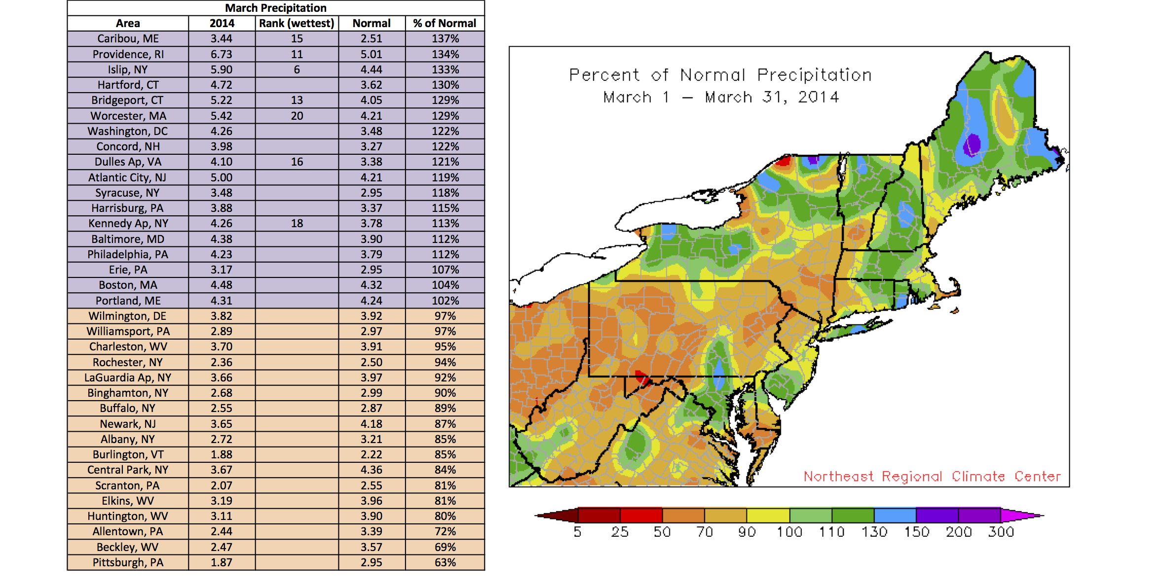 While some areas had an abundance of snow in March, others ended the month with a snow deficit. Of the 17 sites that saw above-normal snowfall, 15 ranked the month among their top 20 snowiest. Washington Dulles, DC had its snowiest March on record. On the flip side, 18 sites saw below-normal snowfall, with 8 ranking the month among their top 20 least snowy. Precipitation was also split between above- and below-normal.