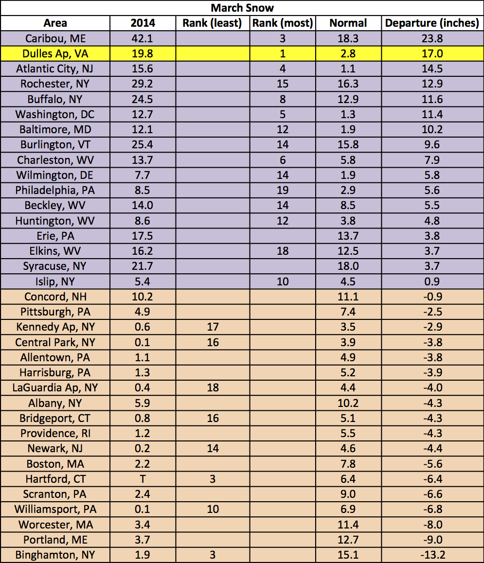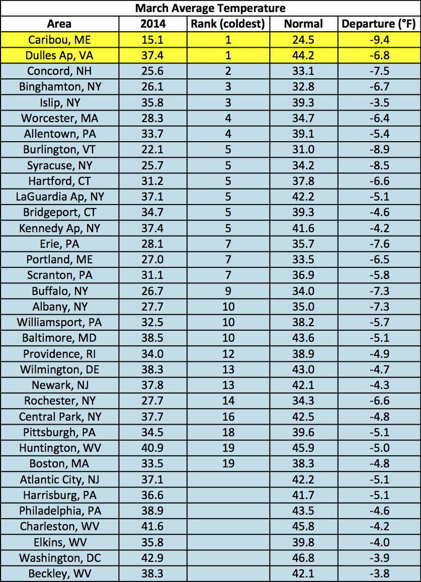 March felt more like a continuation of winter than the start of spring in the Northeast. All 35 airport climate sites were colder than normal, with 28 of them ranking this March among their top 20 coldest. In fact, Washington Dulles, DC and Caribou, ME had their coldest March on record.