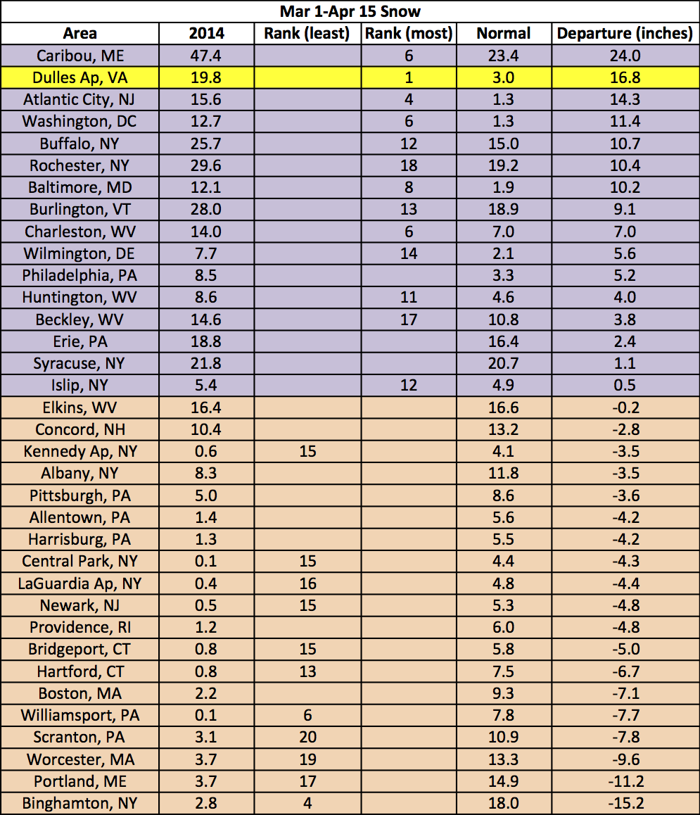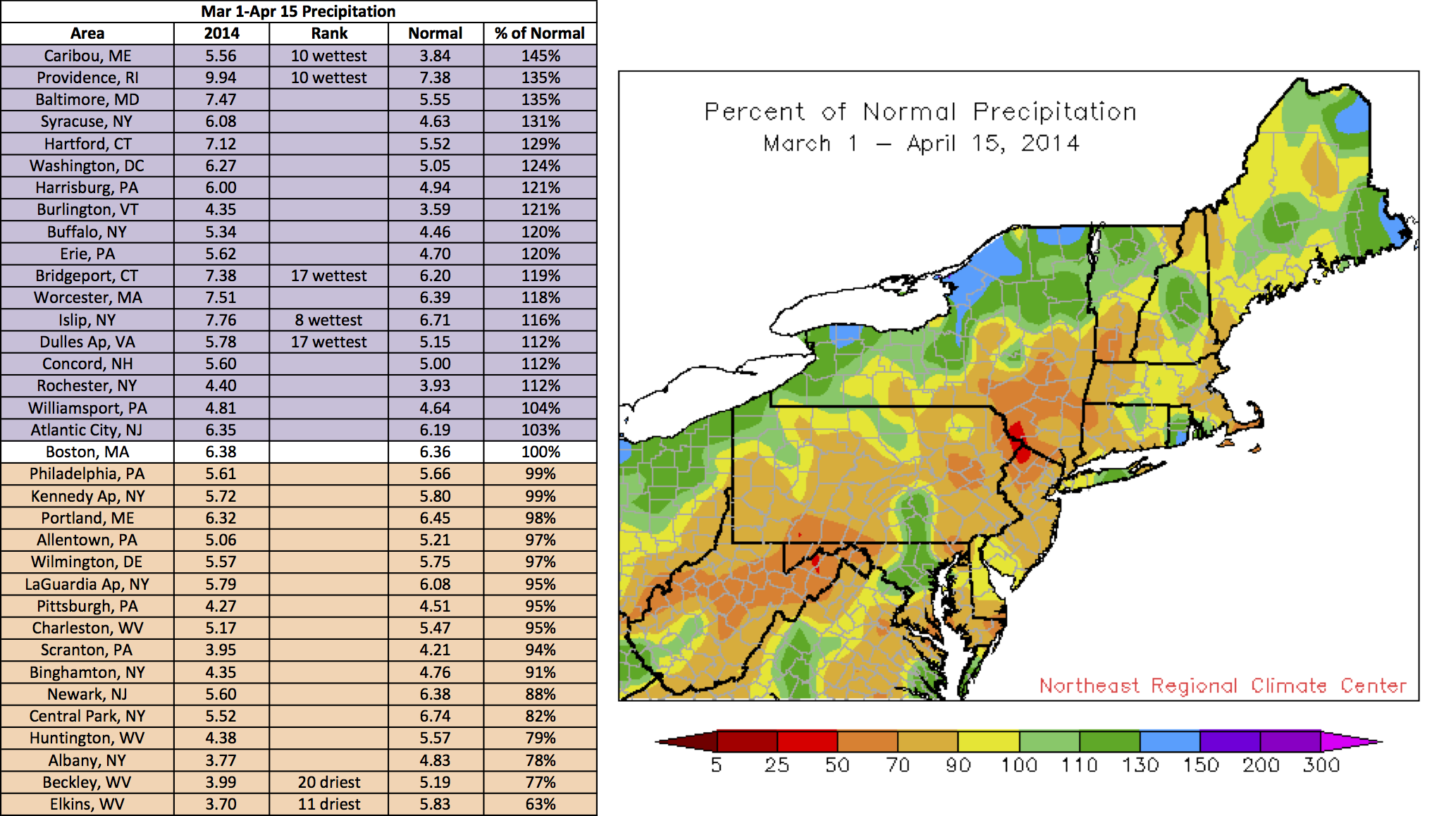Some sites barely saw snow during the first half of spring, but others saw plenty of it. For example, Binghamton, NY, was 15.2 inches below normal for snowfall, but at 16.8 inches above normal, Washington Dulles, DC, had its snowiest first half of spring. Precipitation was also nearly split, with 18 sites above normal and 16 sites below normal.