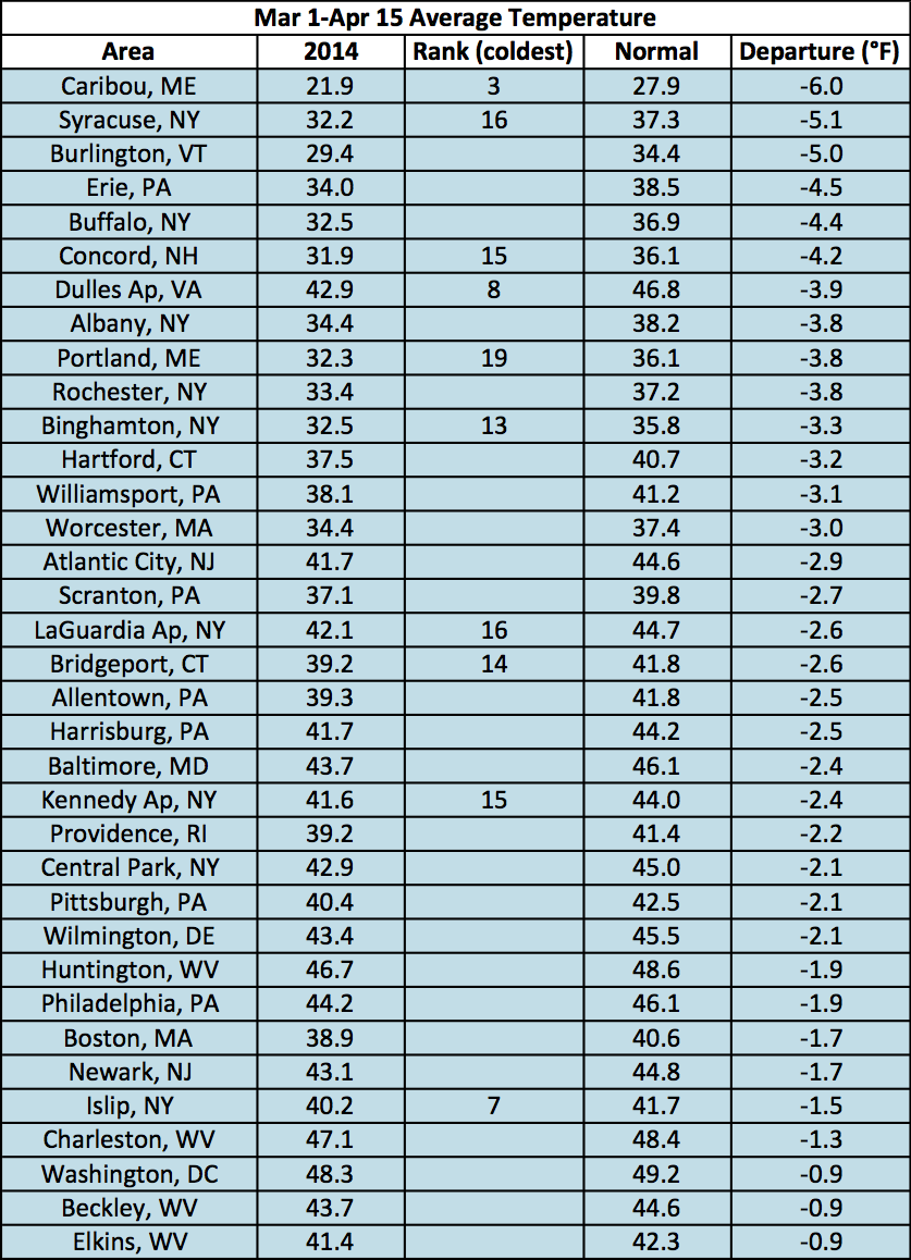While the calendar says mid-April, temperatures so far have not felt spring-like in the Northeast. All 35 airport climate sites saw below-normal temperatures during the first half of spring. Parts of northern New England and upstate New York had departures of over six degrees below normal.