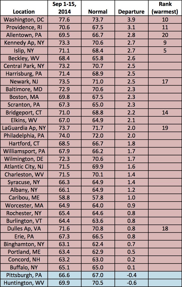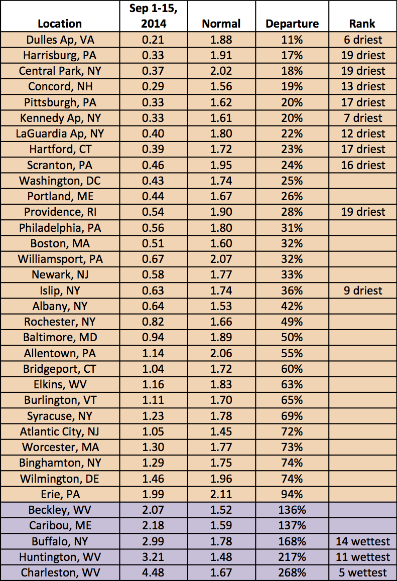 A large portion of the region was quite dry during the first half of September. The majority of the airport climate sites saw only 11 percent to 74 percent of their normal September rainfall. Some of these areas have been experiencing abnormally dry conditions, according to the U.S. Drought Monitor. The few sites that were wetter than normal were quite wet, though. Departures for those sites ranged from 136 percent of normal to 268 percent.