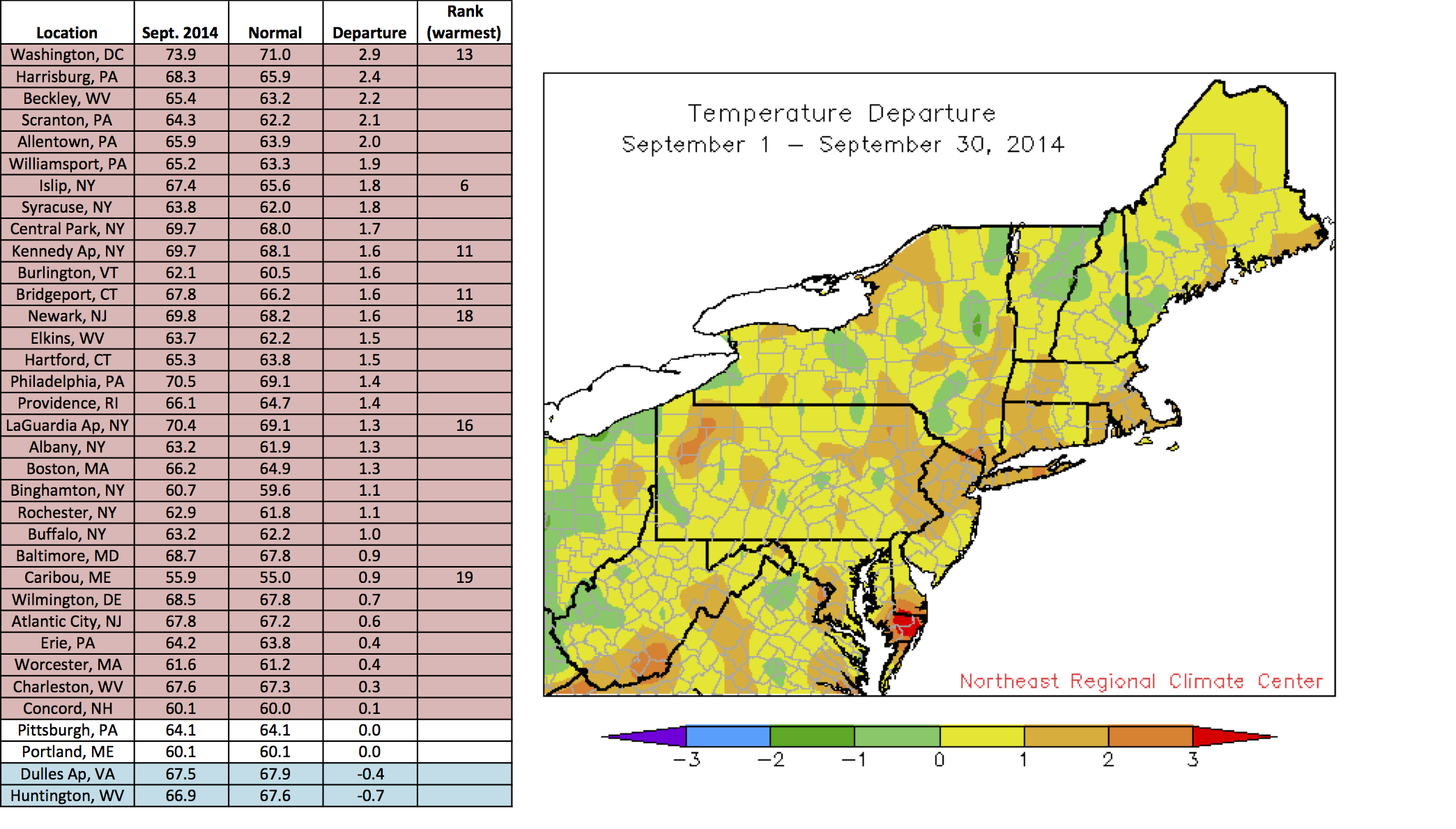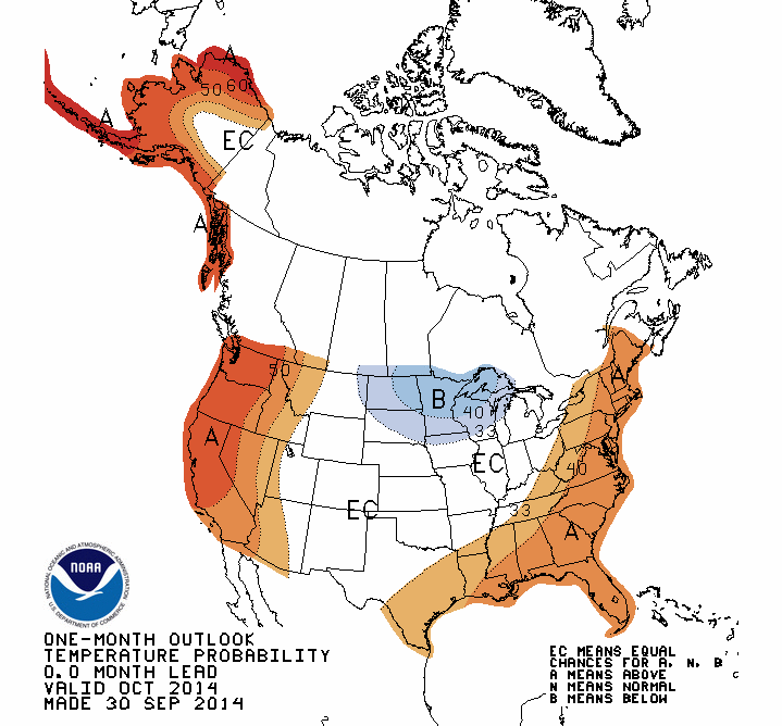September wrapped up on the warm side for much of the region, with temperatures running from near normal to 2 degrees above normal. According to the Climate Predication Center, there is a good chance these warmer-than-normal temperatures will stick around.