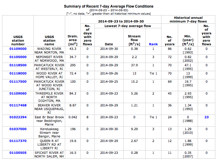 There was not much rain falling in the first month of fall. Almost all of the Northeast airport climate sites saw 80 percent or less of their normal September rainfall. In fact, 22 of the 35 sites ranked this September among their top 20 driest. The month started with 6 percent of the region seeing abnormally dry conditions, but by the end of September, that number had gone up to 25 percent. In addition, the U.S. Drought Monitor placed parts of southern New England in moderate drought. USGS preliminary data continued to indicate that streamflows on many waterways in that area were at record or near-record low levels.