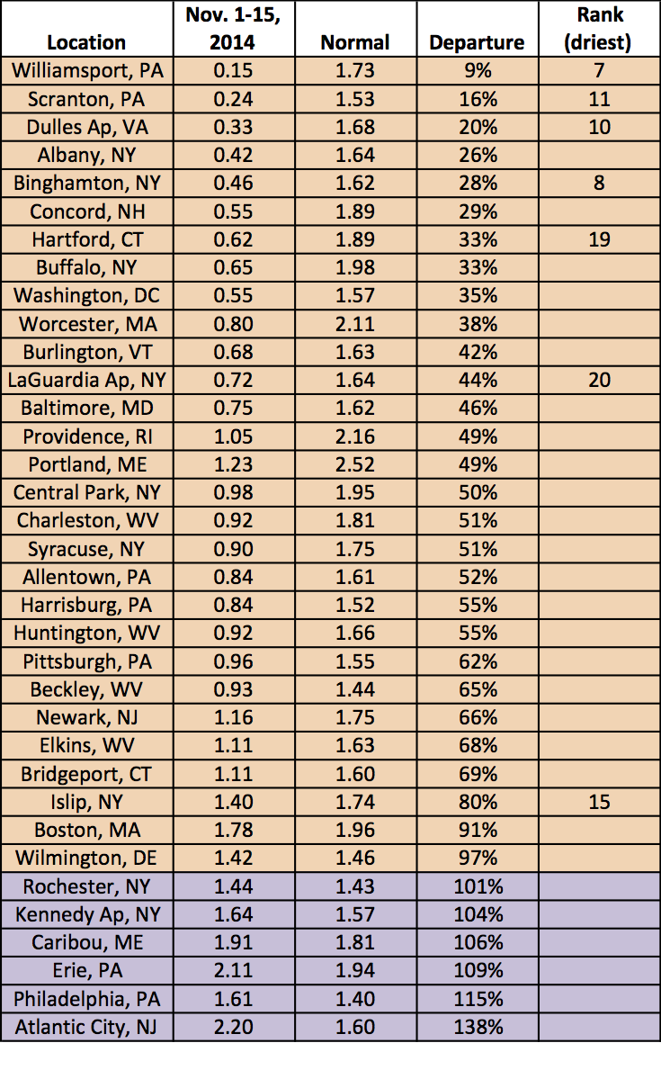 With the exception of a few areas, November so far has been extremely dry in the Northeast. Twenty-nine of the 35 airport climate sites have seen below-normal precipitation, with Williamsport, PA, the driest at 9 percent of normal. With a continuing lack of precipitation, parts of the region are still experiencing abnormally dry and moderate drought conditions.