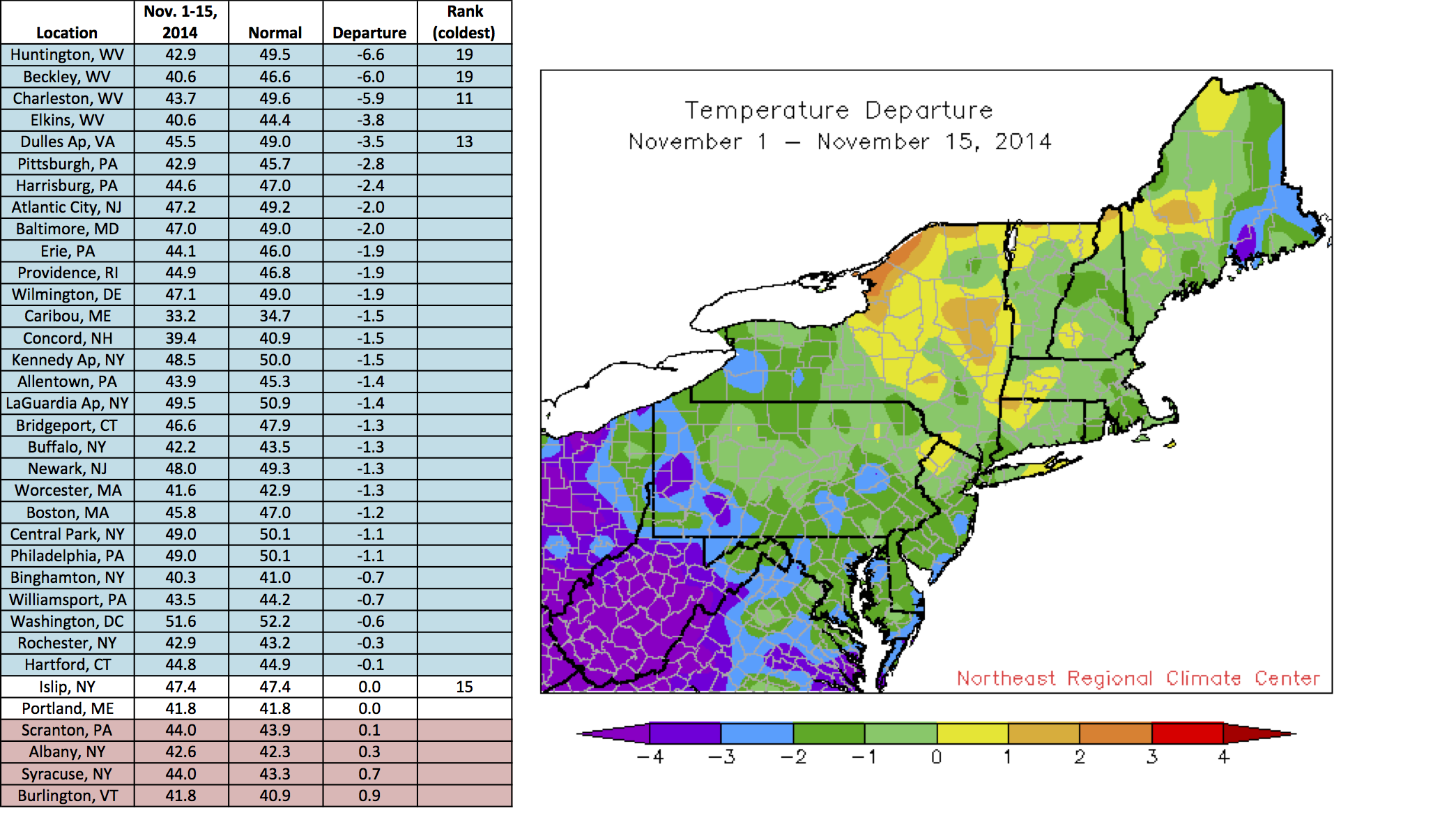 The first two weeks of November were colder than normal at 29 airport climate sites. While the majority of the region was within 3 degrees of normal, West Virginia was much colder. The Mountain State saw temperatures approaching 7 degrees below normal.