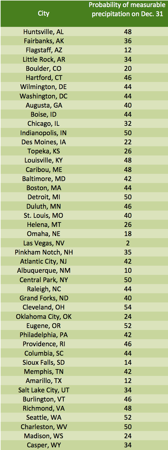 Have you made plans for New Year’s Eve? If you’ll be out on the town in Cleveland, OH, Eugene, OR, or Seattle, WA pack an umbrella! Based on 1964-2013 they have more than a 50% probability of having a wet New Year’s Eve. If you don’t want to worry about rain or snow Las Vegas only has a 2% probability of precipitation.