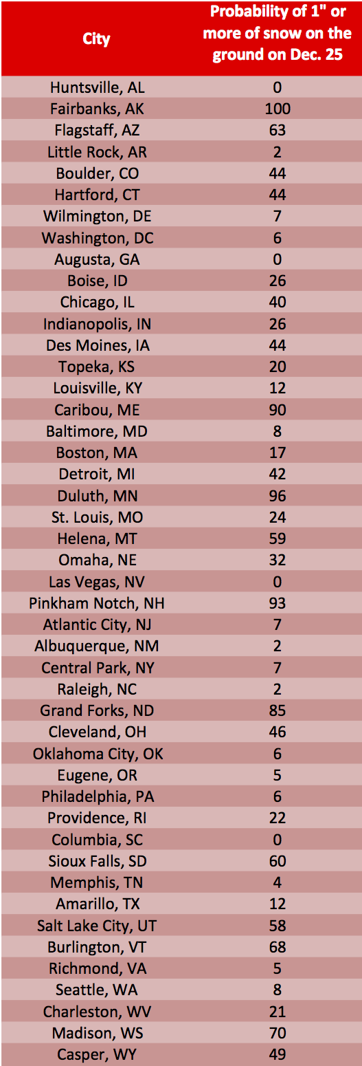 It’s that time of year again. The days are short but lit by twinkle lights and the weather has turned cold, giving hope of a white Christmas. A coastal storm brought several inches of snow to parts of the Northeast the week of December 8th, but will it stick for Jolly Old Saint Nick? It’s still too far away to forecast for the 25th, so we’ll turn to the past. We’ve computed the probabilities (based on 1964-2013) of an inch or more of snow on the ground on December 25th at select cities. Fairbanks, AK, Duluth, MN, and Pinkham Notch, NH, with more than a 90% probability, are your best chances for a white holiday.