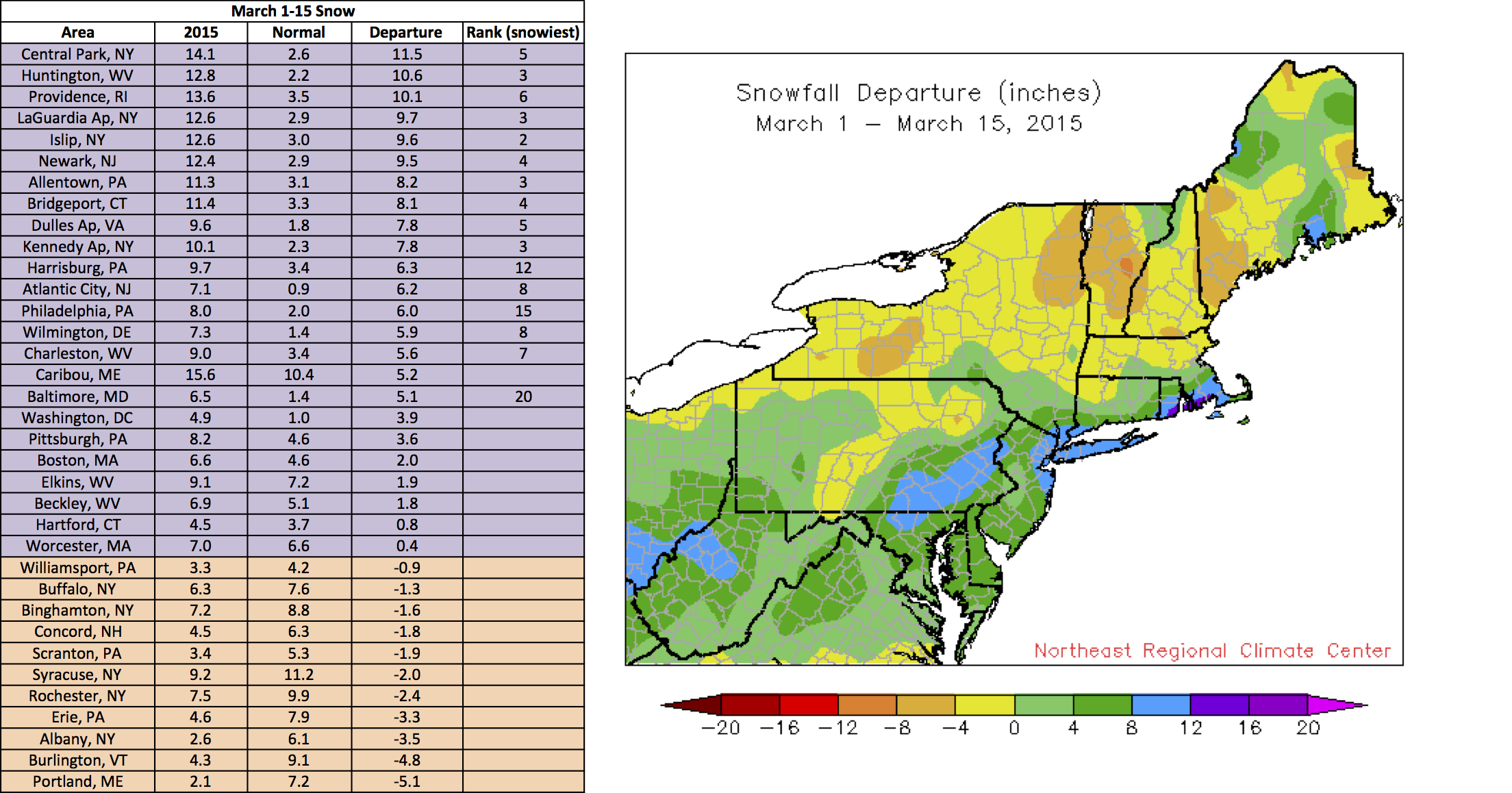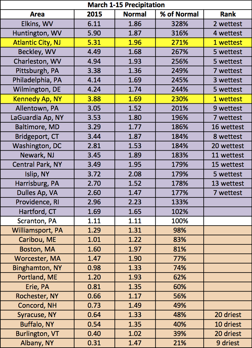 A parade of storms marched across West Virginia and the Mid-Atlantic during the first half of March. Nineteen of the 35 Northeast airport climate sites ranked the period among their top 20 wettest starts to the month, with Atlantic City, NJ, and Kennedy Airport, NY, being record-wet. The wet areas also tended to be snowier than normal, with 16 sites ranking the period among their top 20 snowiest. Conversely, New York and New England were quite dry, with some sites seeing less than 25 percent of normal precipitation. These dry areas also tended to be less snowy.